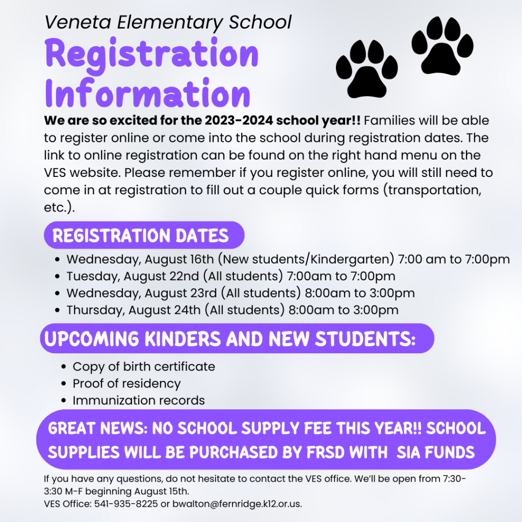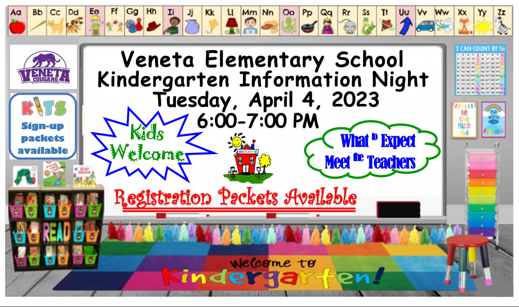 Veneta Elementary’s Kindergarten Information Night will be held on Tuesday, April 4th, from 6:00-7:00pm. Incoming kindergarten students and their parents will meet our kindergarten teachers, learn about kindergarten readiness, and get a chance to see the classrooms. We’re excited to see all our sweet new students. ♥