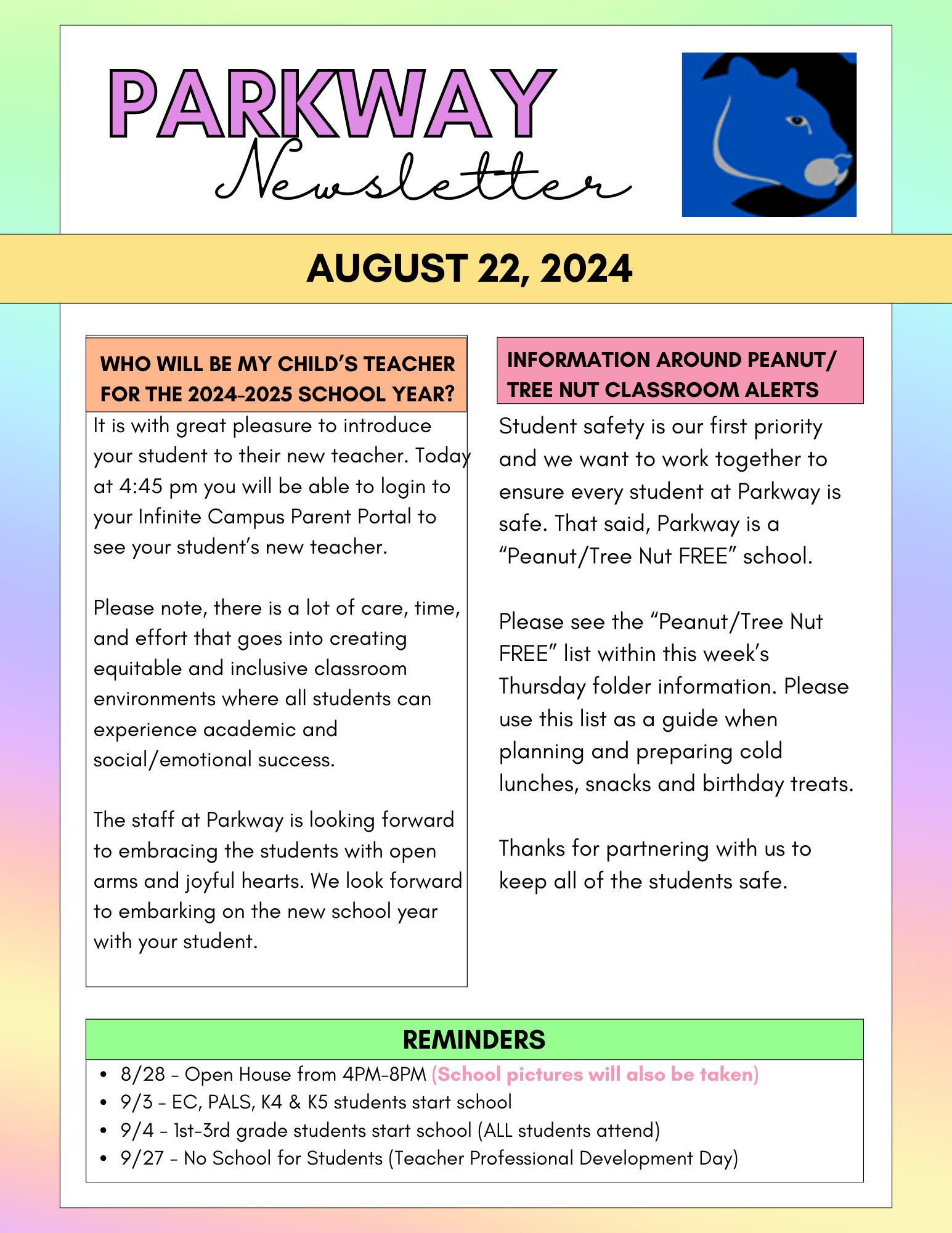 - Reminder: Parent Letter CRASE drill on Fri 5/16