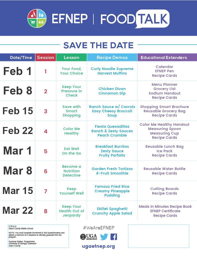 Are you looking for healthier recipes to make for your family while also saving money? We have the classes for you! Glynn County Schools is excited to join forces with the UGA Extension Office's Expanded Food and Nutrition Program (EFNEP) and empower our families with new skills to make healthy choices. During each class, participants will learn healthy cooking methods, food safety practices, and money-saving tips on groceries.