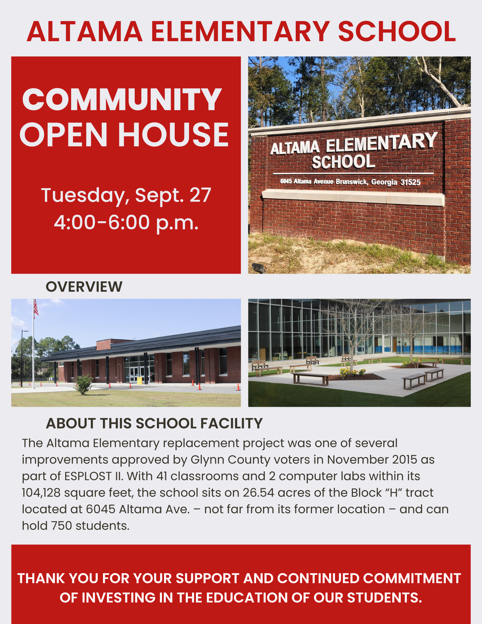 Community Open House for Altama Elementary Planned for Sept. 27 The event will be held from 4:00 to 6:00 p.m. at 6045 Altama Ave. Thank you for your continued support of Glynn County Schools. We look forward to seeing you there!