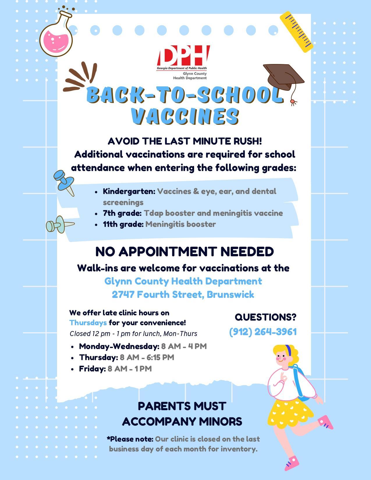 The Glynn County Health Department is offering walk-in service for children and teens who need vaccinations and screenings for the upcoming school year. Students entering kindergarten, 7 grade, and 11 grade must meet vaccination requirements or they can be denied school entry.