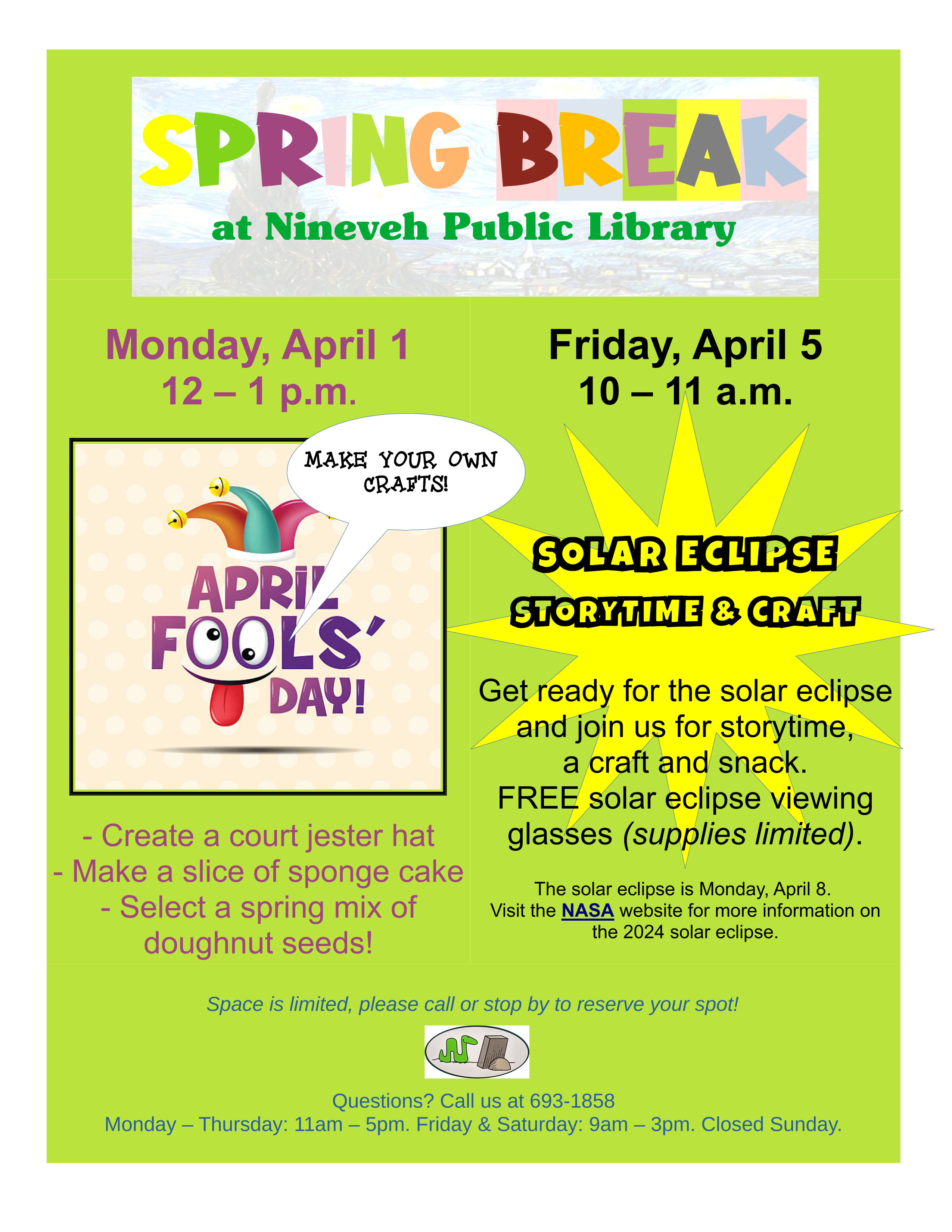 NEWS FROM THE NINEVEH PUBLIC LIBRARY: Just a three-minute drive from school is the Nineveh Public Library, located at 3029 NY-7 between the Hornet’s Nest and the Nineveh Post Office. Operating hours are Monday through Thursday, 11:00 a.m. - 5:00 p.m. and Friday and Saturday 9:00 a.m. - 3:00 p.m. Closed Sunday. Stop by or call (607) 693-1858 if you have any questions, or visit their