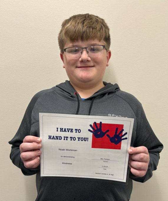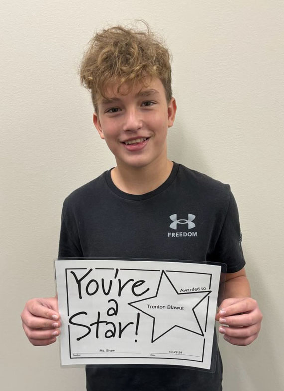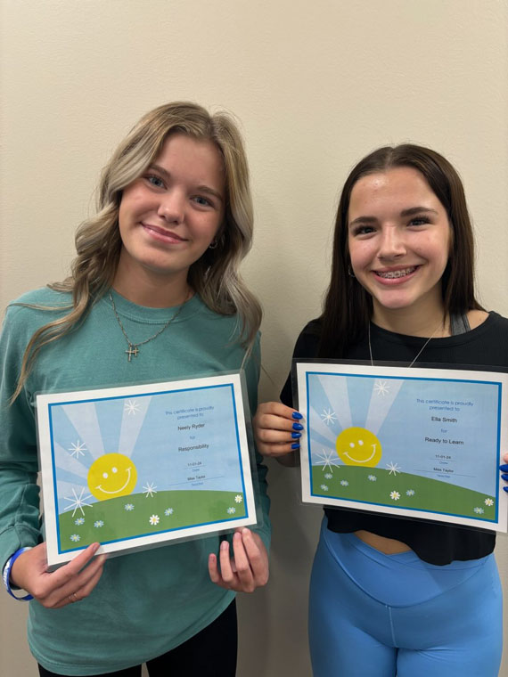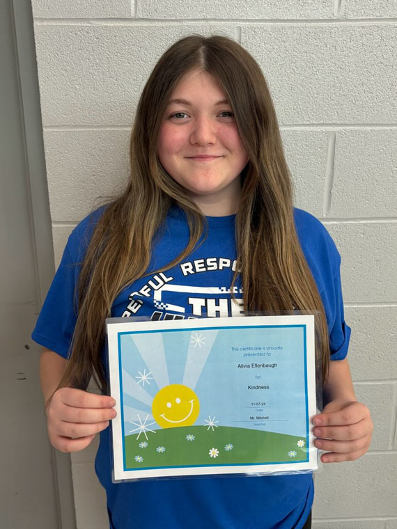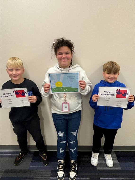 Congratulations to the following students for their positive behavior: Alivia Ellenbaugh and Noah Workman for kindness, Neely Ryder for responsibility, Ella Smith for being ready to learn and Trenton Blawut for being a star.