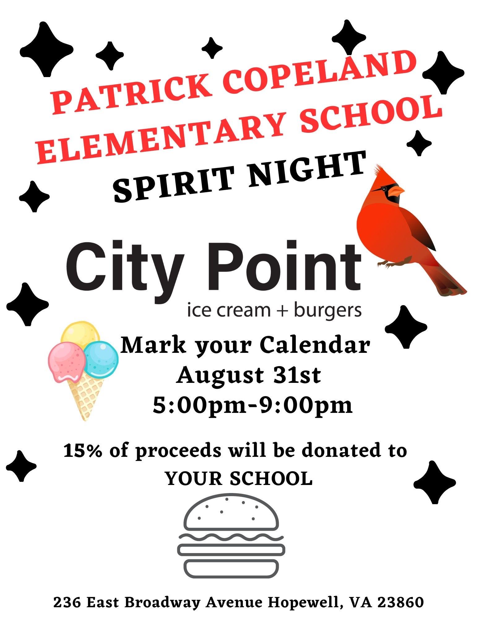 Join Us for Patrick Copeland's Spirit Night! Patrick Copeland is hosting a spirit night at City Point. Join us for burgers and ice cream on August 31st from 5:00 to 9:00 PM.