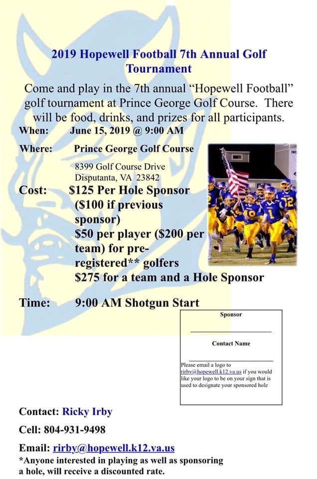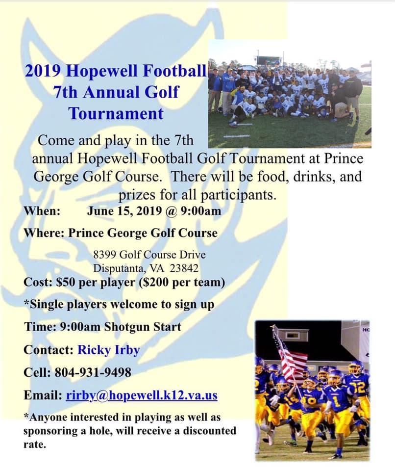 2019 Hopewell Football’s 7th Annual Golf Tournament 2019 Hopewell Football’s 7th Annual Golf Tournament. See flyers for info. Contact Coach Ricky Irby to sponsor and/or sign up a team! Thank you for supporting Blue Devils. Print