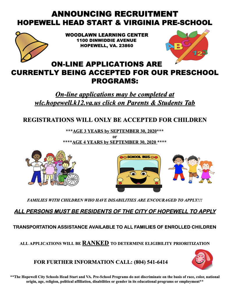 Hopewell Headstart and Virginia Pre-School Now Accepting Applications It's that time of year again! Hopewell Headstart and Virginia Pre-School are now accepting applications. Apply online today! https://bit.ly/374VTKj Print