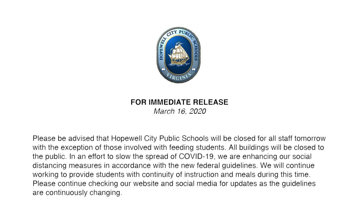 Please be advised that Hopewell City Public Schools will be closed for all staff tomorrow with the exception of those involved with meals for students. All buildings will be closed to the public. In an effort to slow the spread of COVID-19, we are enhancing our social distancing measures in accordance with the new federal guidelines. We will continue working to provide students with continuity of instruction and meals during this time. Please continue checking our website and social media for updates as the guidelines are continuously changing.