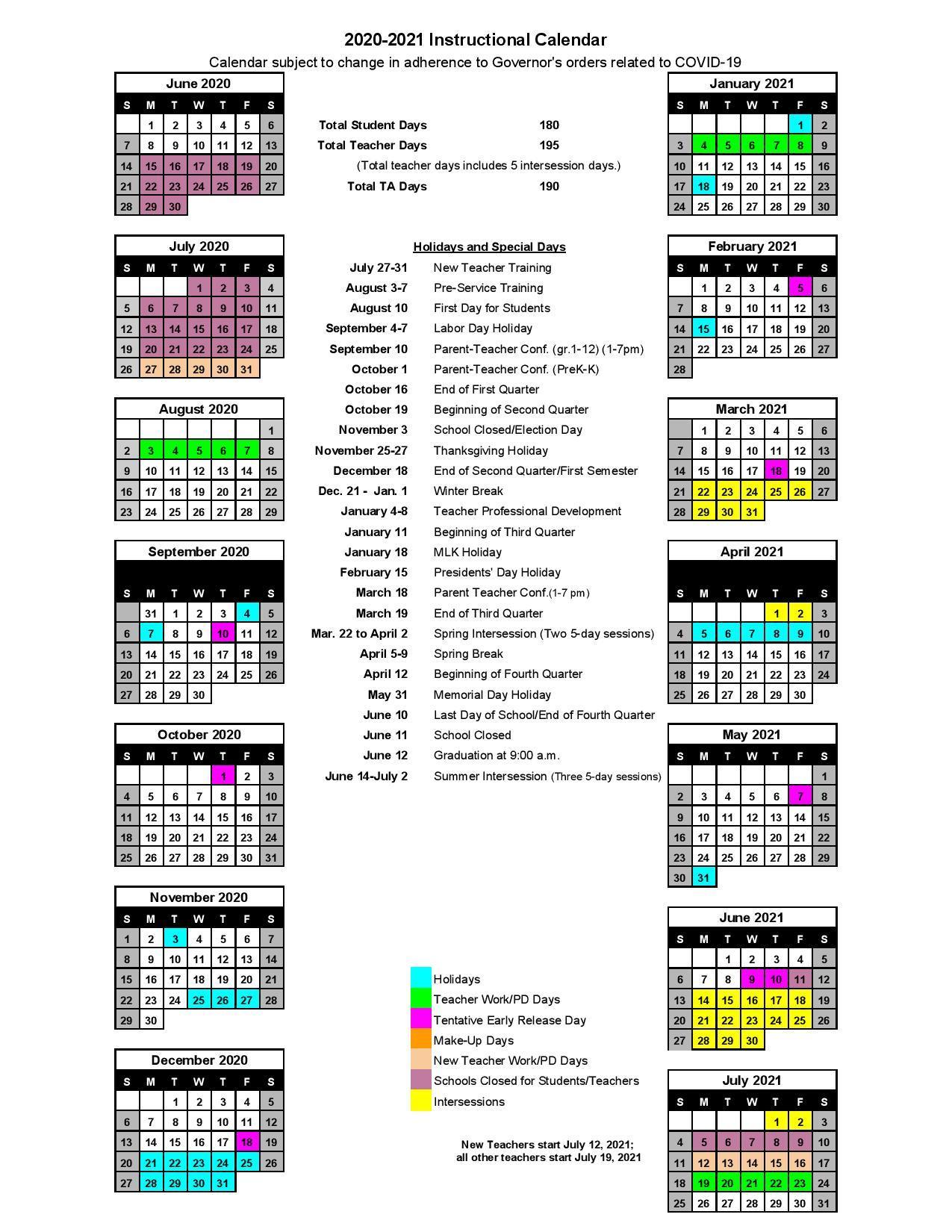 At yesterday evening's 6/11/2020 school board meeting, and in response to the safety challenges caused by COVID-19, the board approved an updated 2020-2021 school calendar. A copy of that calendar is attached. An effort was made to preserve the structure and integrity of our previous calendar, while delaying our start.