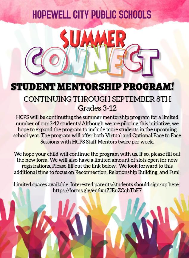 We're excited to announce that we will be extending our summer mentorship program! If you are already a part of the program and would like to continue, please fill out the form link. We will also have additional spaces that may open up, so if you are new to the program, please fill out the form below.