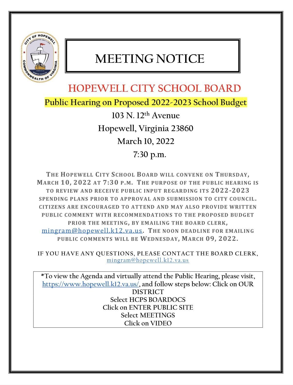 THE HOPEWELL CITY SCHOOL BOARD WILL CONVENE ON THURSDAY, MARCH 10, 2022 AT 7:30 P.M. THE PURPOSE OF THE PUBLIC HEARING IS TO REVIEW AND RECEIVE PUBLIC INPUT REGARDING ITS 2022-2023 SPENDING PLANS PRIOR TO APPROVAL AND SUBMISSION TO CITY COUNCIL. CITIZENS ARE ENCOURAGED TO ATTEND AND MAY ALSO PROVIDE WRITTEN PUBLIC COMMENT WITH RECOMMENDATIONS TO THE PROPOSED BUDGET PRIOR THE MEETING, BY EMAILING THE BOARD CLERK,