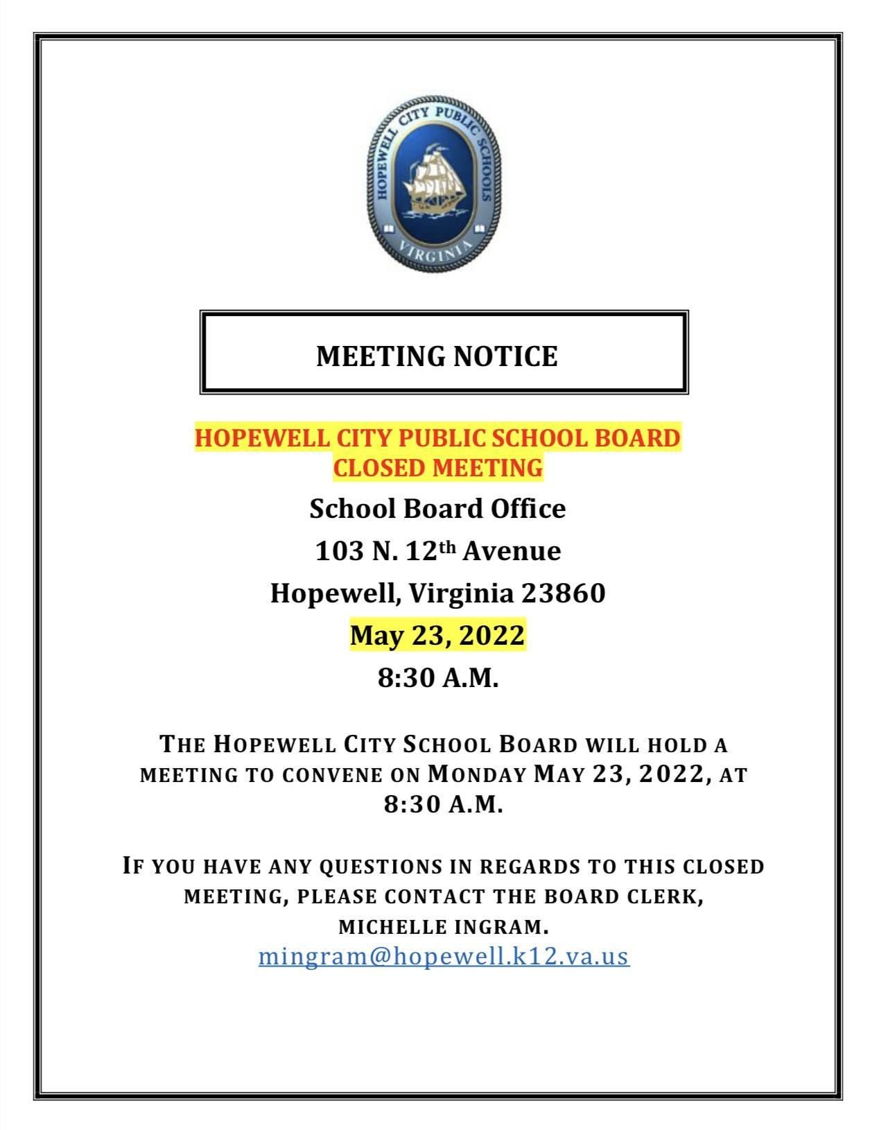 Monday, May 23rd: Hopewell City Public Schools Closed School Board Meeting