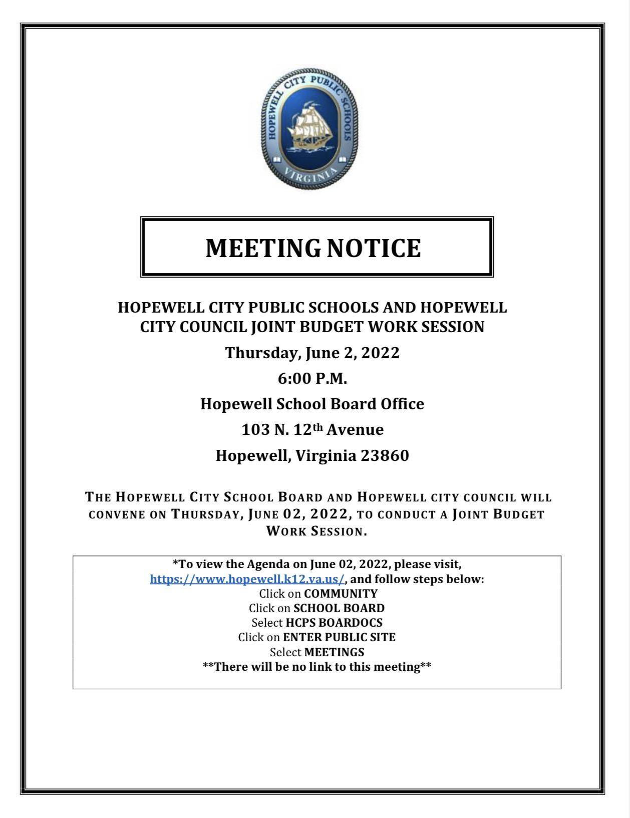 Thursday June 2nd Hopewell City Public Schools & Hopewell City Council Joint Budget Work Session Print