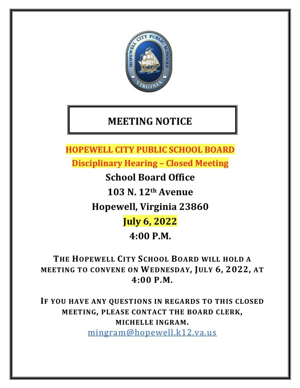 School Board Closed Meeting Notice for Wednesday, July 6, 2022