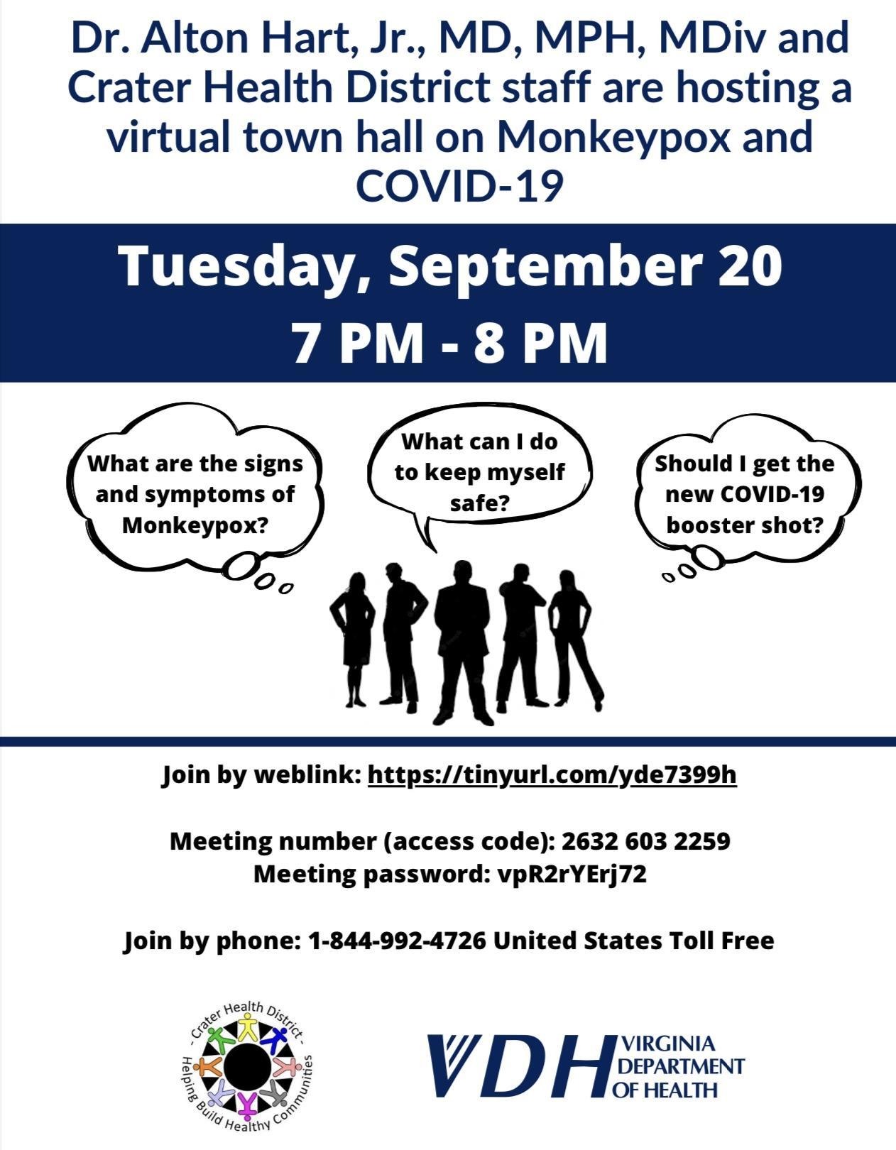 Crater Health District COVID-19 & Monkeypox Virtual Town Hall To join the virtual town hall use the information below: web link: https://tinyurl.com/yde7399h Meeting ID: 2632 603 2259 Meeting Password: vpR2rYErj72 Join by phone: 1-844-992-4726 (United States Toll Free) Print
