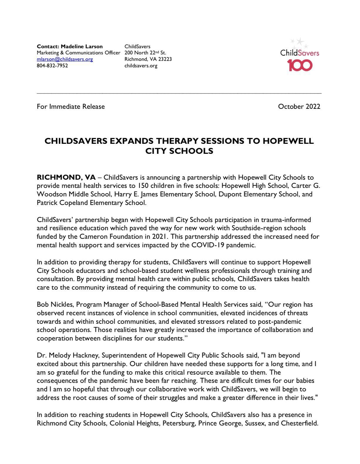 ChildSavers Expands Therapy Sessions to Hopewell City Public Schools