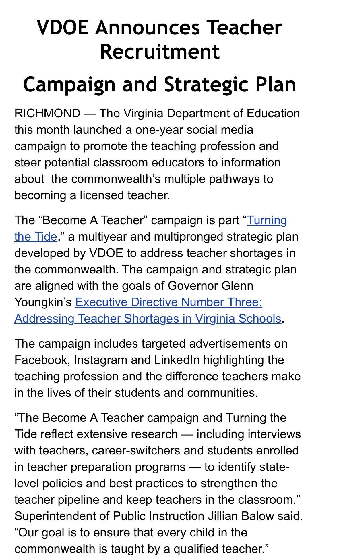 VDOE Announces Teacher Recruitment Campaign and Strategic Plan