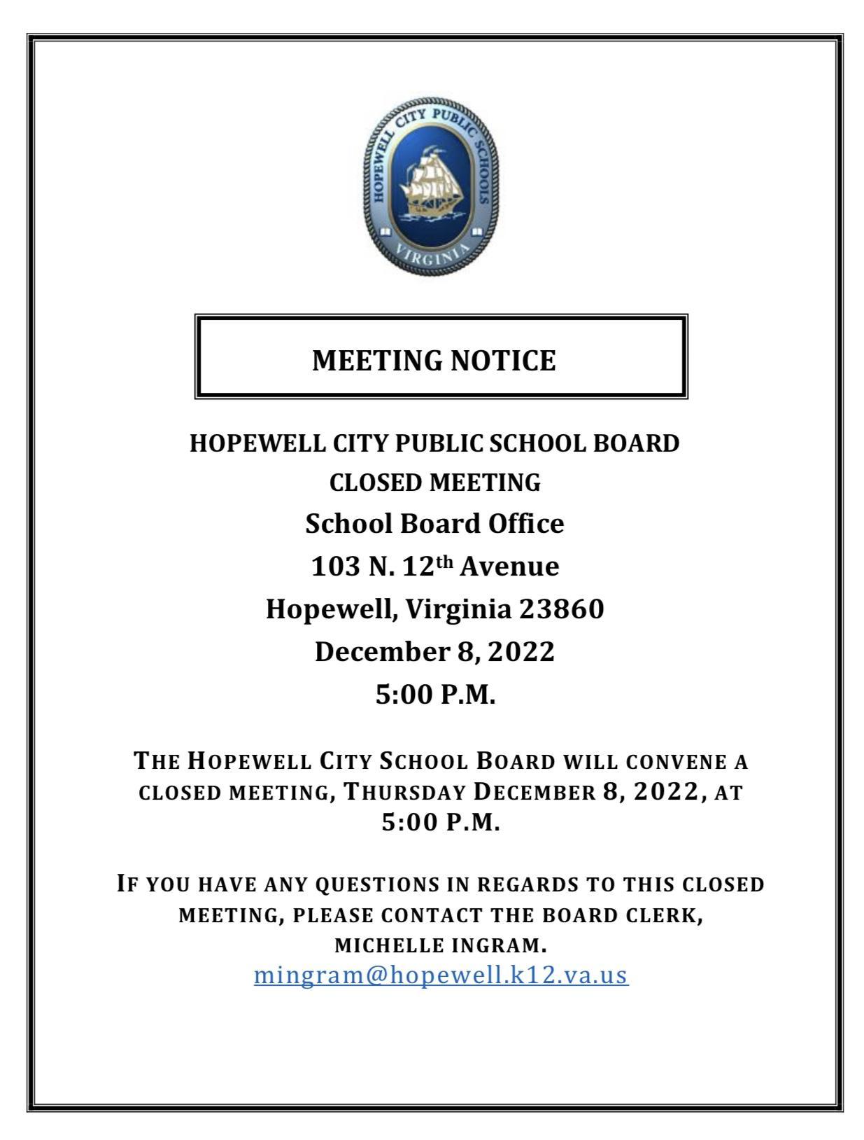 Hopewell City Public Schools Closed Meeting Notice