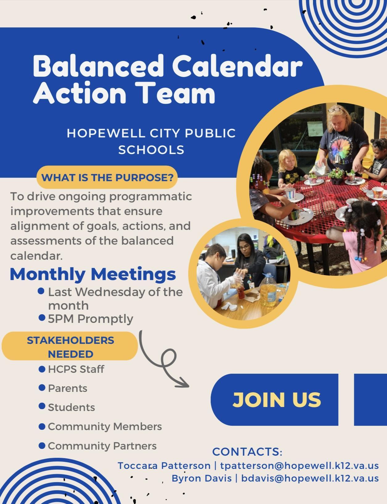 Join the Hopewell City Public Schools Balanced Calendar Action Team The goal for this team is to drive ongoing programmatic improvements that ensure alignment of goals, actions, and assessments of the balanced calendar. Print