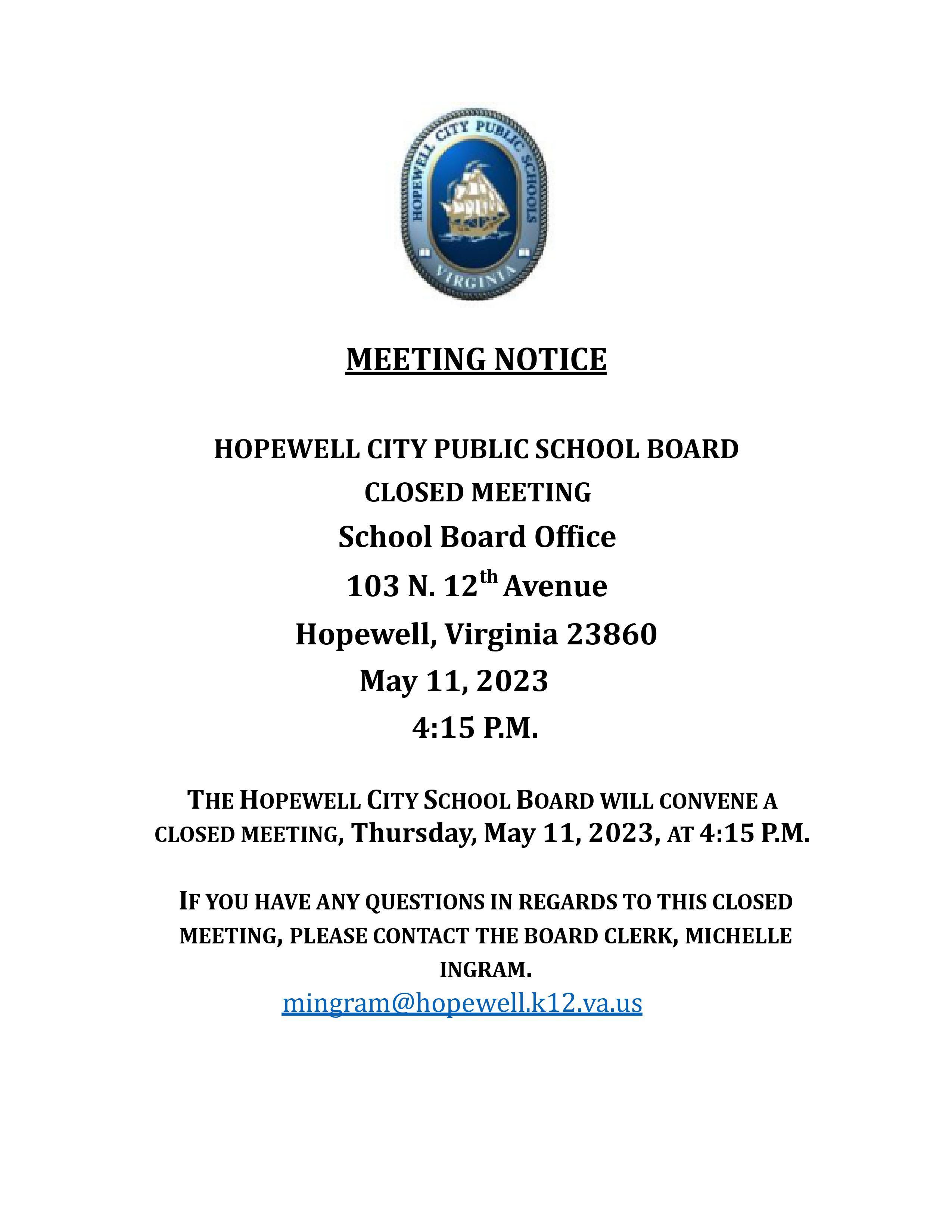 Hopewell City Public Schools Closed Meeting Notice