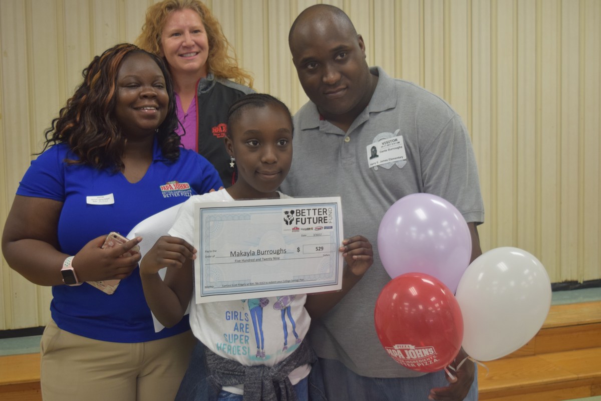 Makayla Burroughs, a fifth grade student at Harry E. James Elementary, was announced as a Better Future Fund winner on April 17 during a special fifth grade assembly in the cafeteria. Burroughs was awarded a $529 College Savings Plan from Virginia529, a family pack of tickets to the Nascar Race at RIR on April 29, and her classmates received coupons from Papa John’s Pizza. Harry E. James Elementary also received $250, which will be used toward the fifth grade graduation ceremony and a pizza pack for the ceremony.