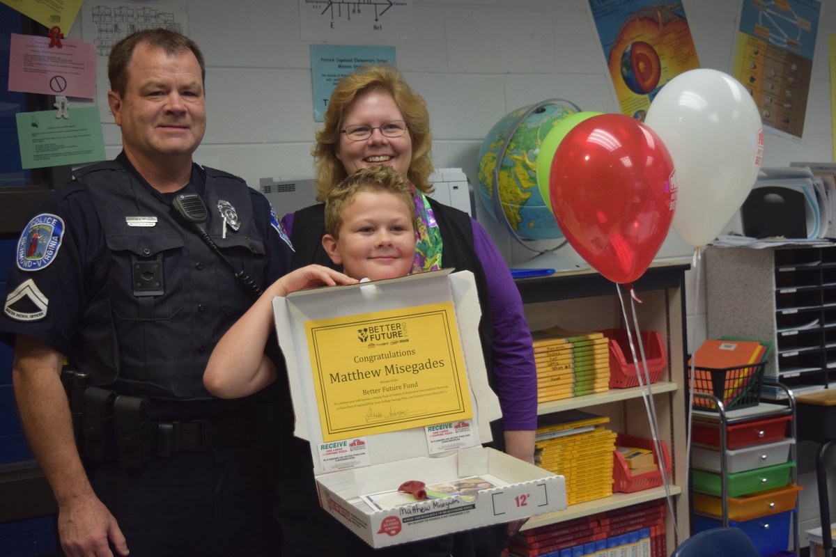 Matthew Misegades, a fifth grade student at Patrick Copeland Elementary, was named a first place winner and was surprised on April 18, when it was broadcasted over the morning announcements. Misegades received a $1,000 College Savings plan from Virginia529, a family pack of tickets to the Nascar Race at Richmond International Raceway on April 30, on stage recognition at the race, and his classmates received coupons from Papa John’s Pizza. Due to his first place winnings Patrick Copeland also received $529 to be used toward the fifth grade graduation ceremony and a pizza pack from Papa John’s for the ceremony.