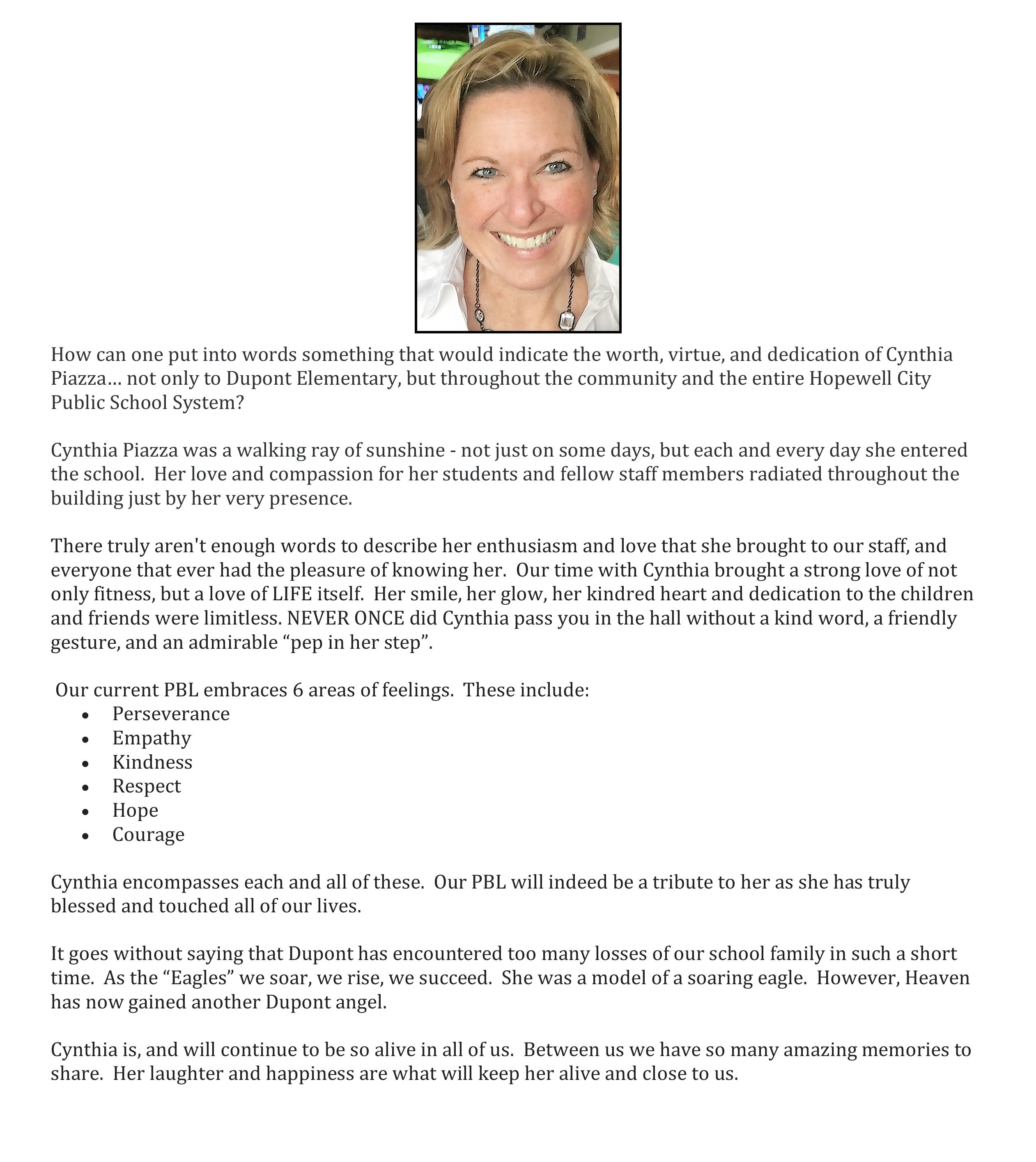 Cynthia Piazza Remembered Cynthia Piazza your legacy will forever live on in the hearts of all of the HCPS students and staff that you touched. #hopewellmagic https://www.morrissett.com/obituary/Cynthia-L.-Piazza/Chesterfield-VA/1820650?fbclid=IwAR30qioXCom_0_2DRL9xBr38TarFSzmhE12QO24BSFkaGq9AE9uxTMVanj4 Print