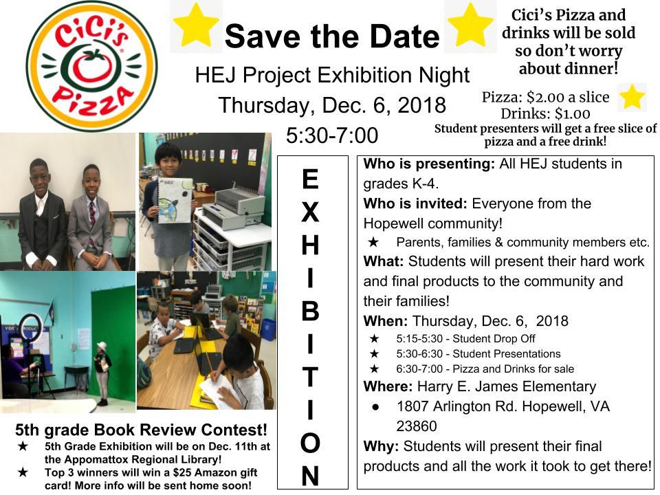HEJ Project Exhibition Night You're invited! Join HEJ as they celebrate student exhibitions with project displays and presentations! Pizza and drink from CiCi's Pizza will be available for purchase. See flyer for more details. #hopewellmagic Print