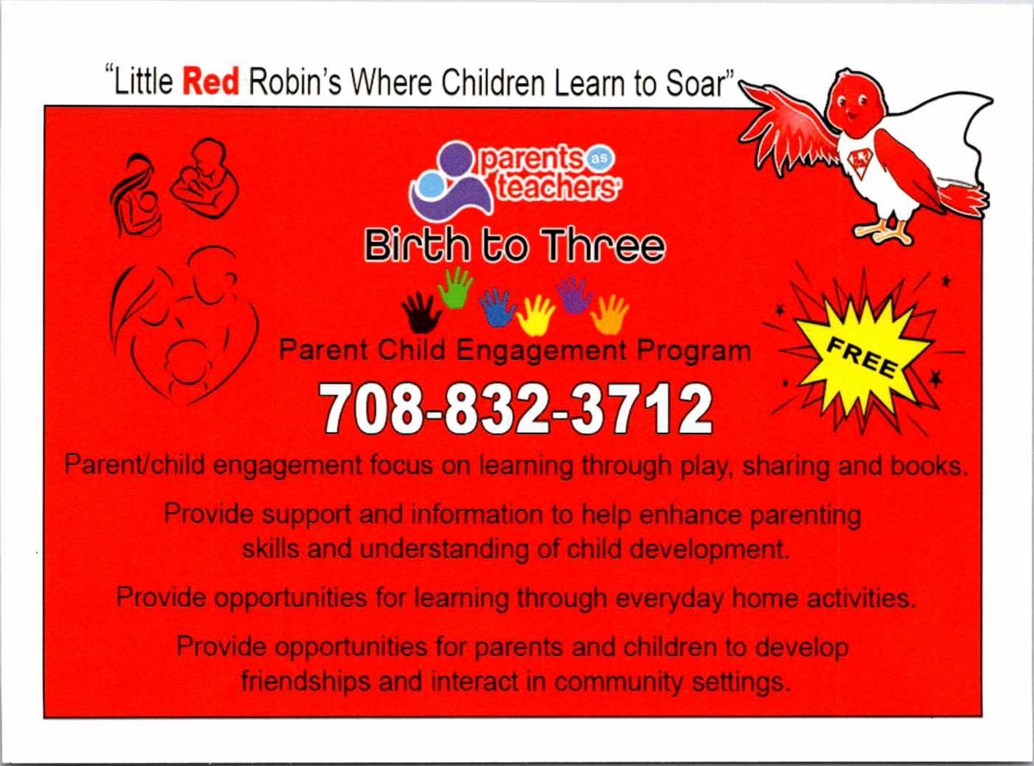 We are thrilled to offer our extraordinary Birth to Three program, specially designed for families with young children. This program is funded by the Illinois State Board of Education and is FREE for qualifying families. Our trained parent educators use the Parents as Teachers curriculum to support your child's development.