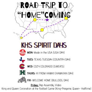 Unfortunately, some traditional events have been canceled due to the pandemic. The Homecoming parade, dance and KHS Powderpuff game will not occur next week.