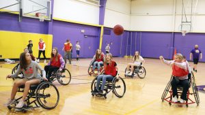 One group of students was taught how to play basketball while in wheelchairs, under the guidance of Midwest Adaptive Sports Wheelchair Basketball Director Matt Bollig. The other group played blind kickball, with Weston showing them how to follow the directions of their sighted helpers and to use audio signals – loud clapping and ringing made by other students – to locate the bases.
