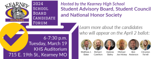 Kearney, Mo., February 28, 2024: Kearney School District residents have an opportunity to learn more about the Board of Education candidates during a public forum hosted by student leaders from 6 to 7:30 p.m. on Tuesday, March 19 in the auditorium at Kearney High School.