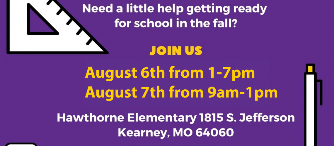 Supplies and clothing donations will be accepted at the District Office (150 West State Route 92, Kearney, MO) beginning July 5th. Donations will also be accepted at Hawthorne Elementary on August 3rd & 4th between 9am-3pm.