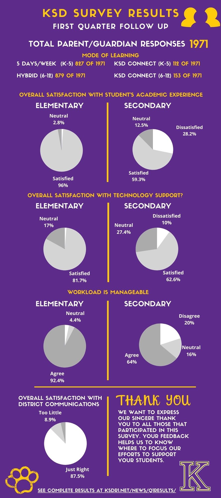 At the November Board of Education meeting, KSD’s Director of Academic Services, Jennifer Kopp, shared the results of the First Quarter Follow Up Survey. This survey was sent to KSD Parent/Guardians asking them to share feedback related to academics, communication and more. The graphic below displays highlights from those survey results.