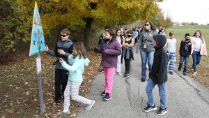 Jaci Berntt stood with two of her classmates in front of their sign on a crisp, overcast Thursday and expounded eloquently about how the American Hornbeam bird helps produce the plant matter eaten by an herbivore Cottontail rabbit, which may, in turn, become fuel for a Barred Owl.