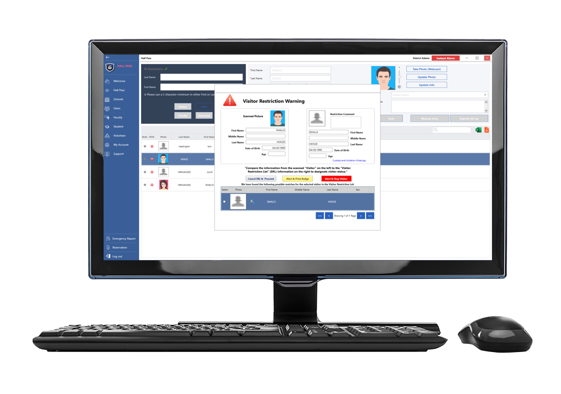 When entering a school, each visitor must present a government-issued ID at the front office. The ID is scanned, and in seconds, Hall Pass conducts a check against the national database of registered sex offenders and a list of restricted visitors. This process will be conducted with anyone who may come into contact with a student, including parents/guardians who are picking up their children.