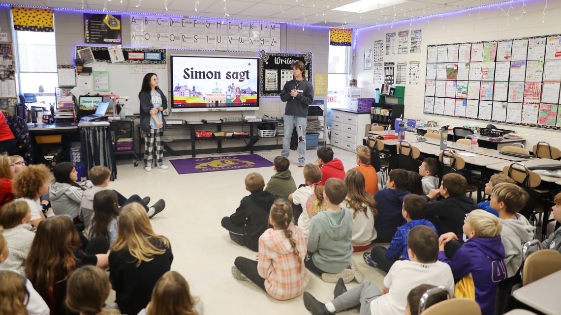 A group of foreign language students from Kearney High School visited classrooms at all four Kearney School District elementary schools today. The teens led 20-minute lessons in Spanish and German for the younger students.