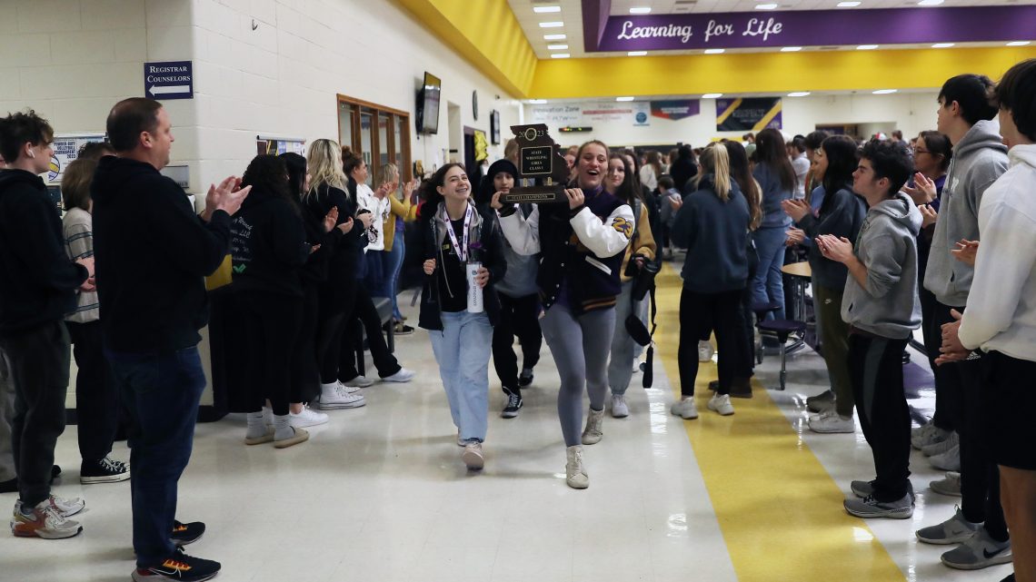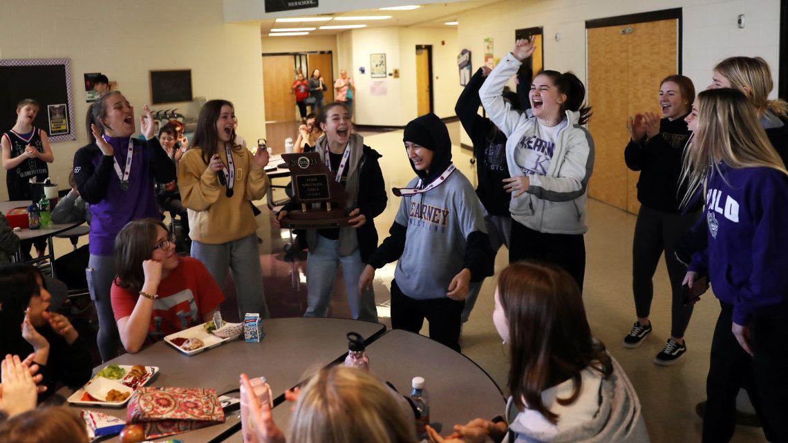 After a late-night return to Kearney following the Thursday evening medal ceremony, the team celebrated their state championship with a victory tour on Friday morning. This included stops at all of the schools in Kearney School District, where the team and coaches high-fived with cheering throngs of students and staff. (LINK: KHS Girls Wrestling 2023 State Championship Victory Tour Photos)