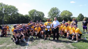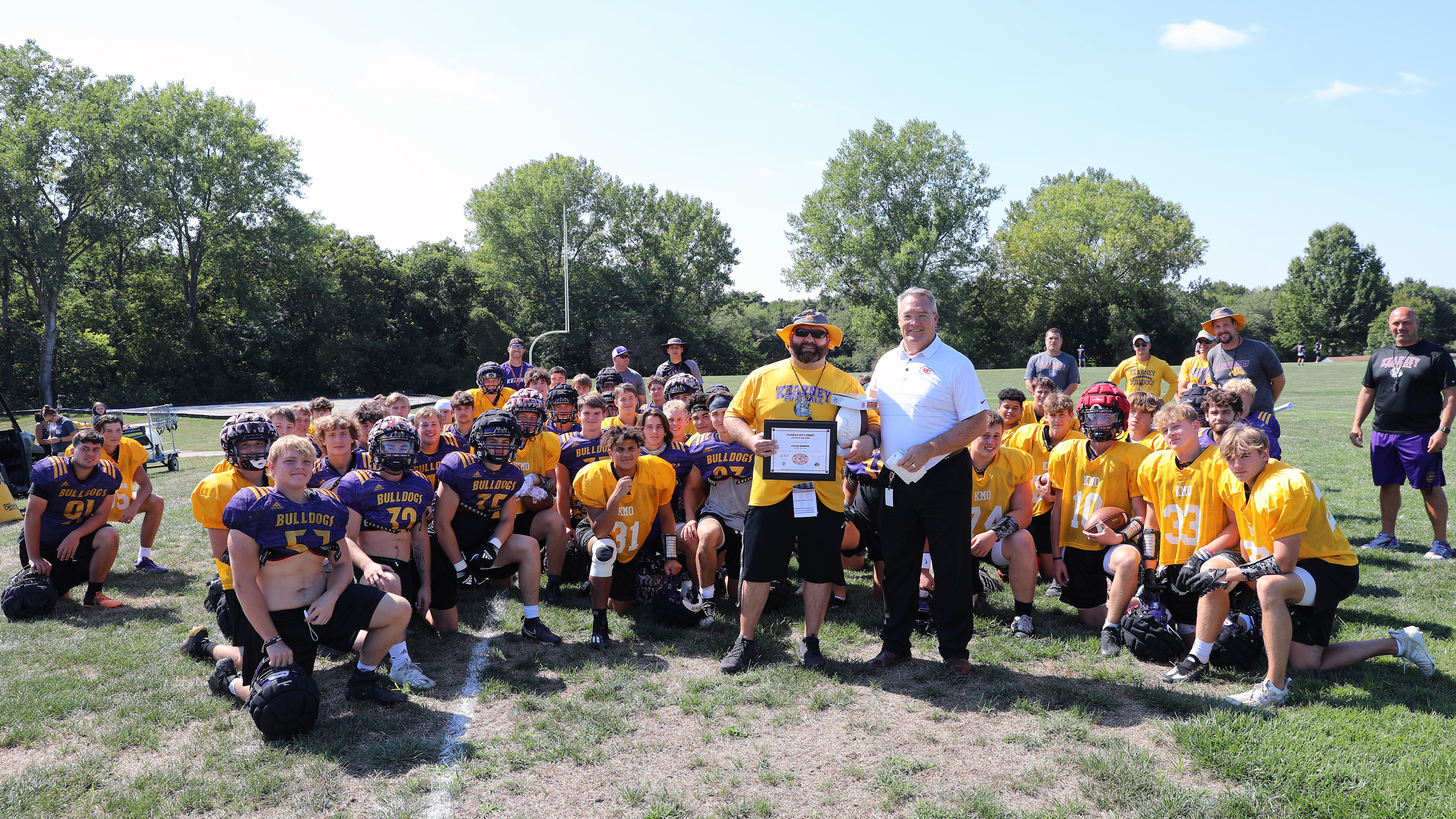 Chiefs Director of Special Events Gary Spani visited the Bulldogs’ practice field for a short ceremony with the team and Coach Minnick on Wednesday afternoon, Sept. 7. Spani – a member of the College Football Hall of Fame and Chiefs Hall of Fame – presented Minnick with a special plaque and football signed by Chiefs Head Coach Andy Reid. The honor also comes with $500 from the Chiefs.