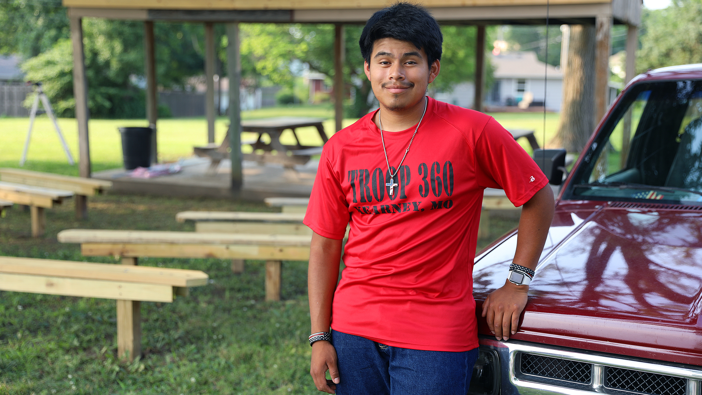 Taking a break, Luke leaned up against his maroon Chevy truck in his red troop t-shirt and a small cross on a necklace.