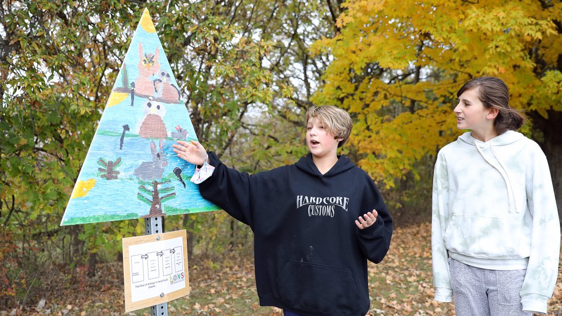Jaci Berntt stood with two of her classmates in front of their sign on a crisp, overcast Thursday and expounded eloquently about how the American Hornbeam bird helps produce the plant matter eaten by an herbivore Cottontail rabbit, which may, in turn, become fuel for a Barred Owl.