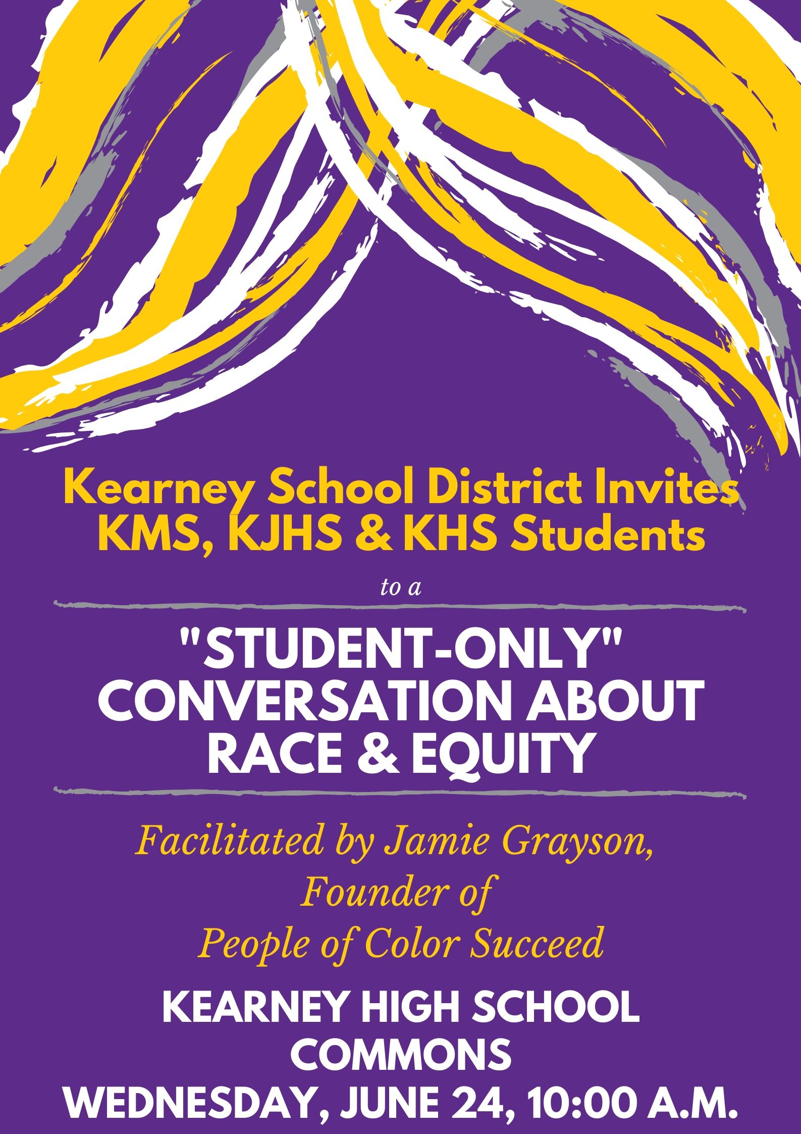 KSD would like to invite all secondary students to a “student-only” conversation about race and equity. In light of current events, we know many of our students are confused and concerned. Some students want to be part of the solution in Kearney, but they don’t know how. This would be an opportunity for them to voice their concerns and have their voices heard. The conversation will be facilitated by Jamie Grayson who is the founder of POAC (People of All Color Succeed). We are looking for students who are interested in an open dialogue. This conversation will be held in the commons area of Kearney High School on Wednesday, June 24th at 10:00 AM.