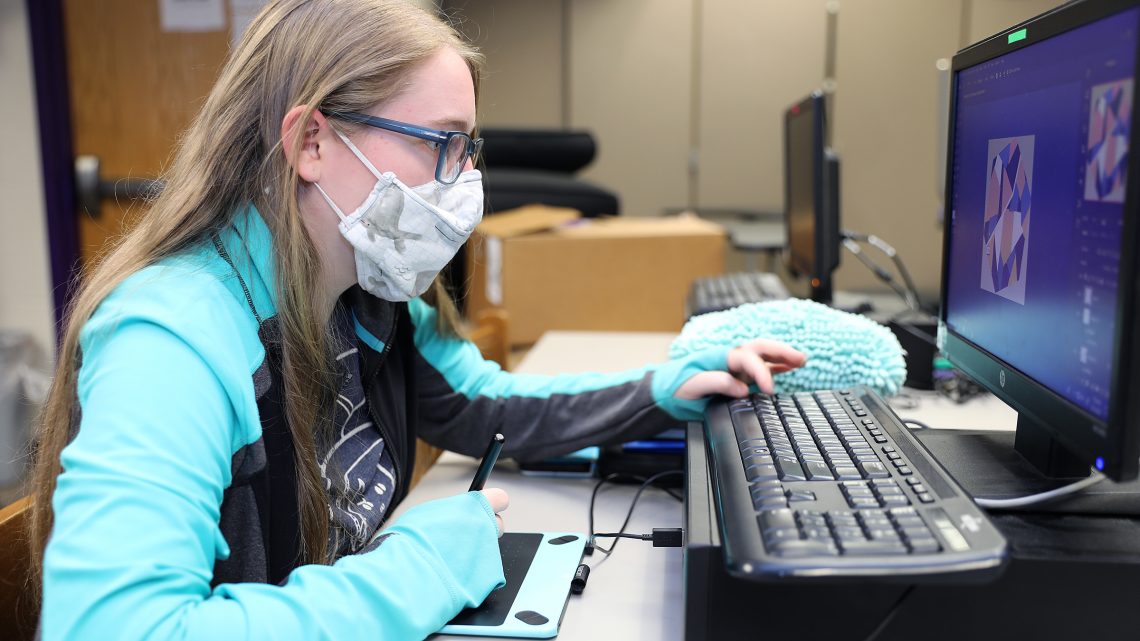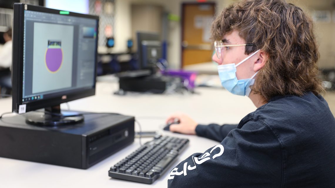 On a clear, crisp Thursday morning, Michaela and three other students were spread throughout their classroom, hunched intensely over black desktop computers and making careful, minute adjustments to their draft designs with Adobe Photoshop. The room was emptier than usual because the seniors were no longer in the building.