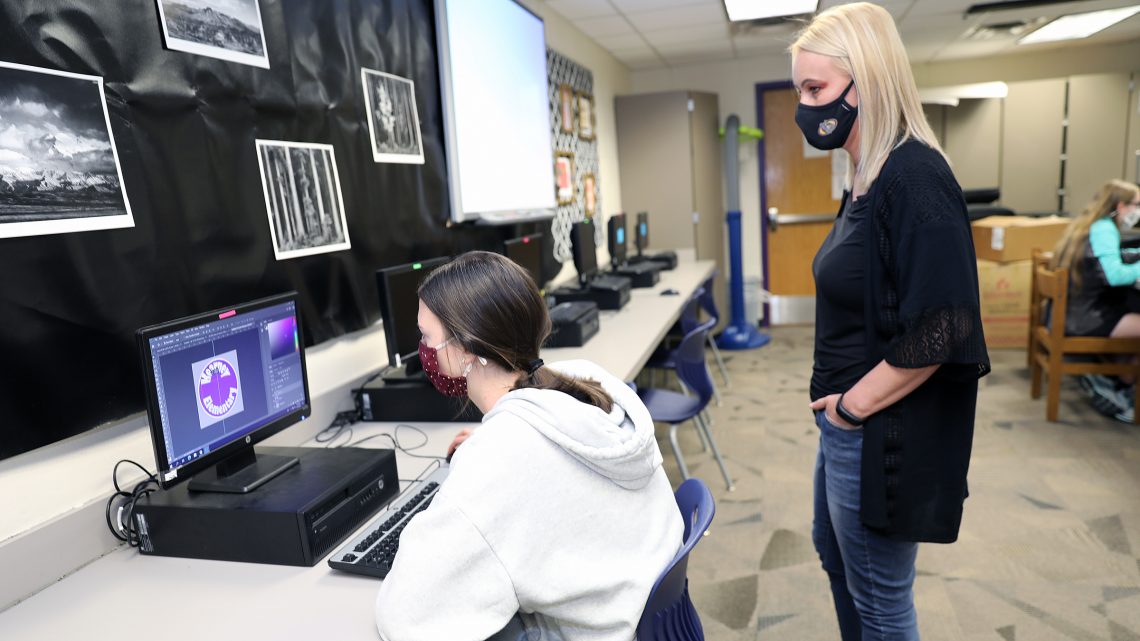 Ms. Schmohl, a junior at Kearney High School, and her graphic design classmates are engaged in a Real World Learning experience designed to equip them with tangible products that will make them more valuable when they enter the job market.