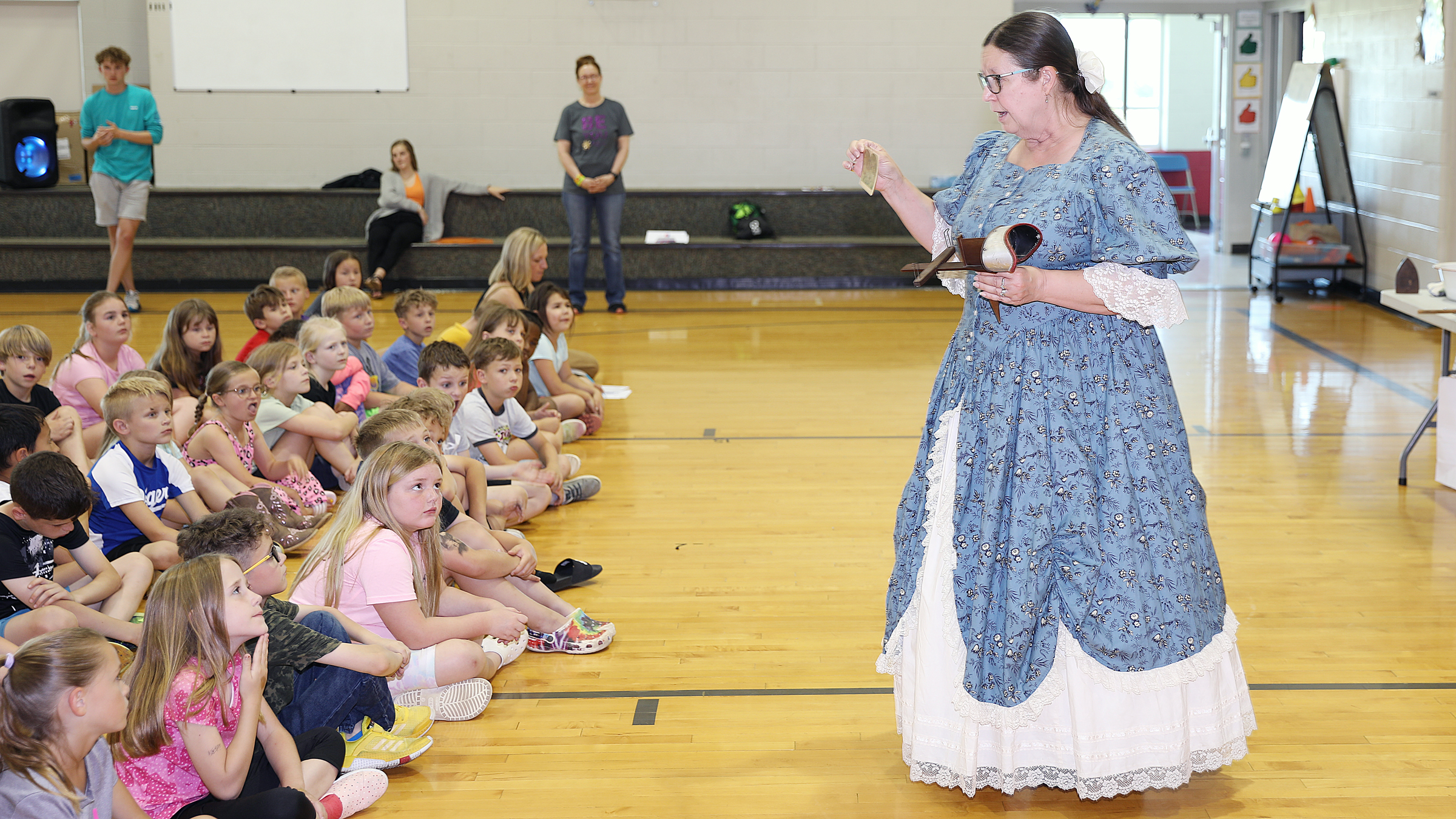 Holding up a 150-year-old stereoscope that is part of the museum’s collection, Spencer explained how the device helped children in the 1870s experience places around the world before the advent of modern media. She wore a blue and white dress from the same time period in order to enhance the experience for the students.