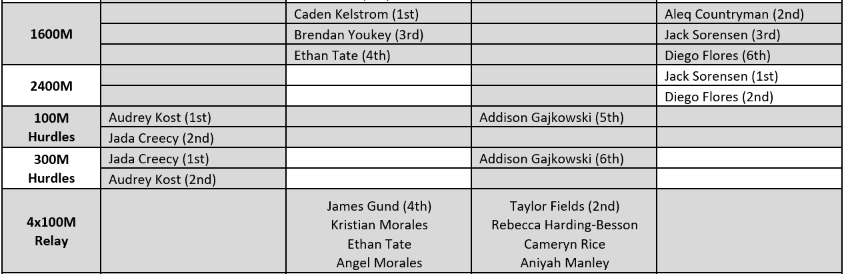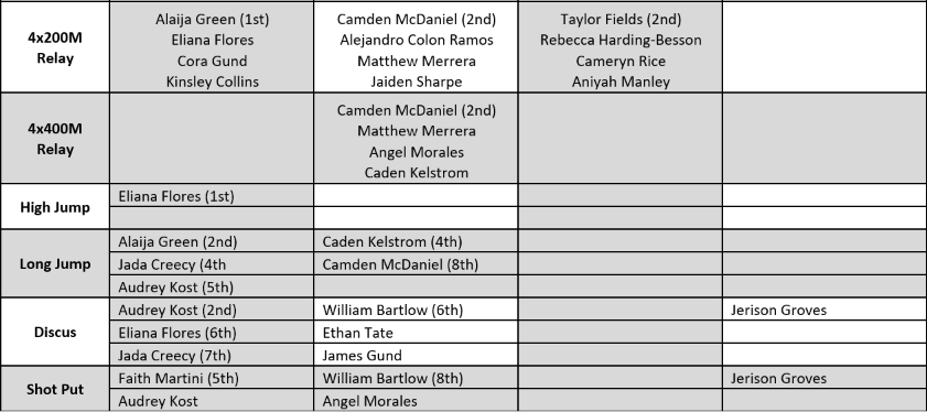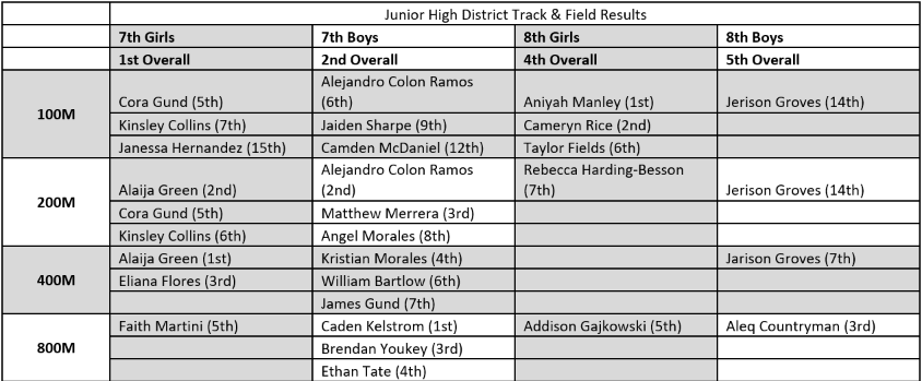 Last Wednesday our Junior High Track & Field teams competed in the District Track & Field meet in Charlotte. All of the students did their best and were very competitive. The 7th grade girls won their division while the 7th boys came in second by one point (106-105). I have listed the results for all of our students. *Click the charts below to expand the view: |