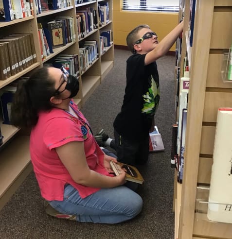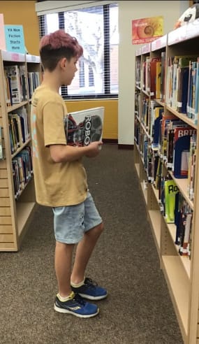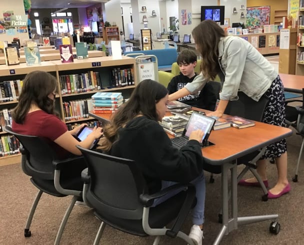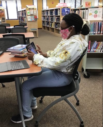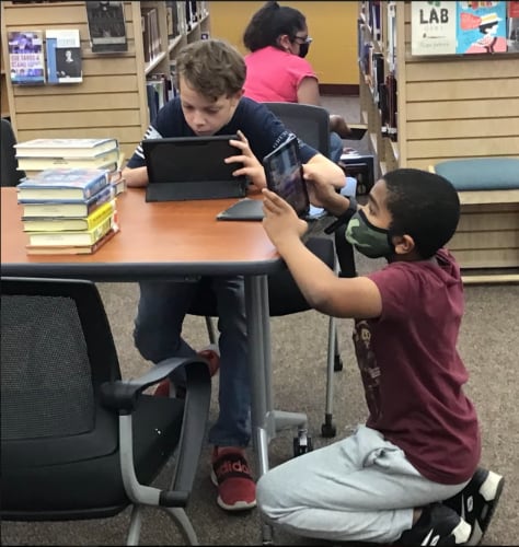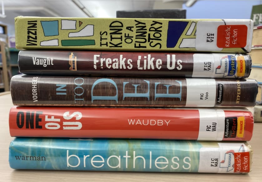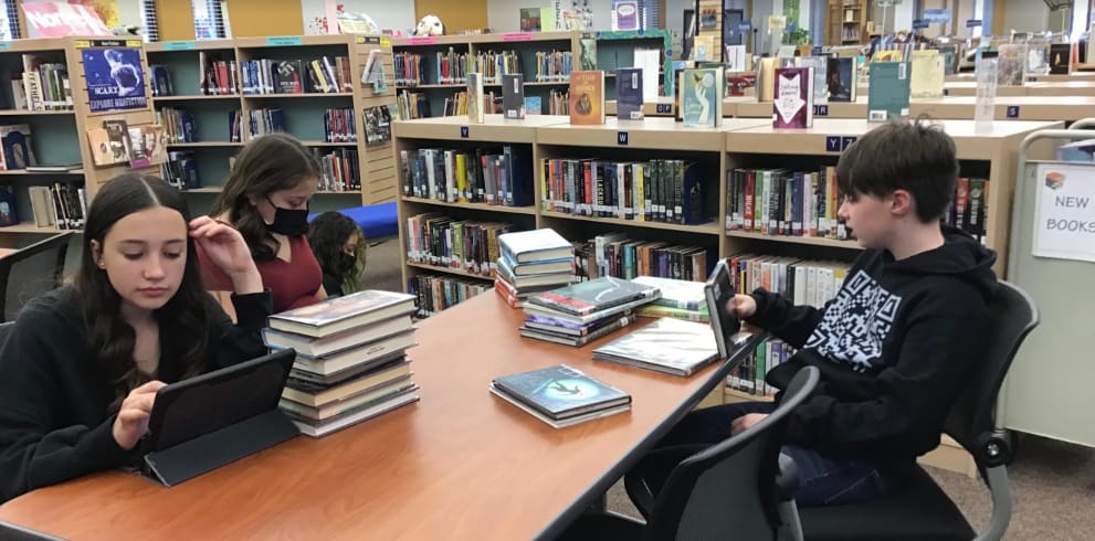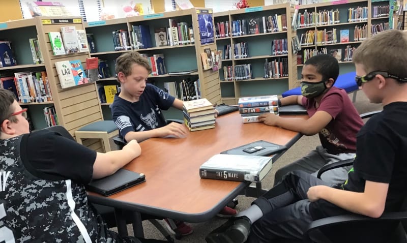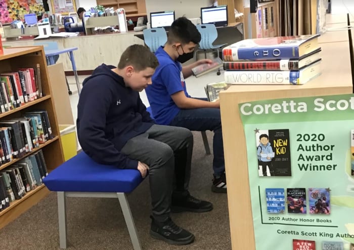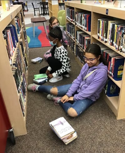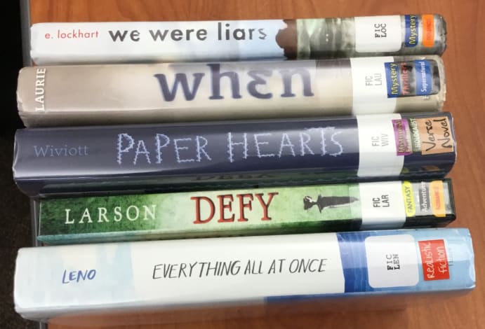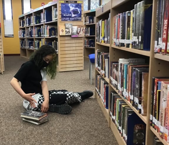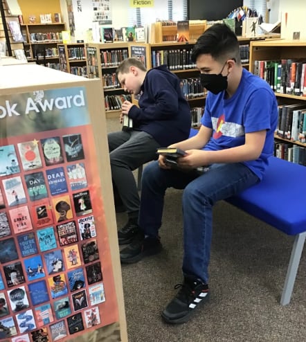 “Mrs. Clark-Chan’s 6th grade ELA classes wrapped up their poetry unit with a visit to the library to create book spine poems.” |