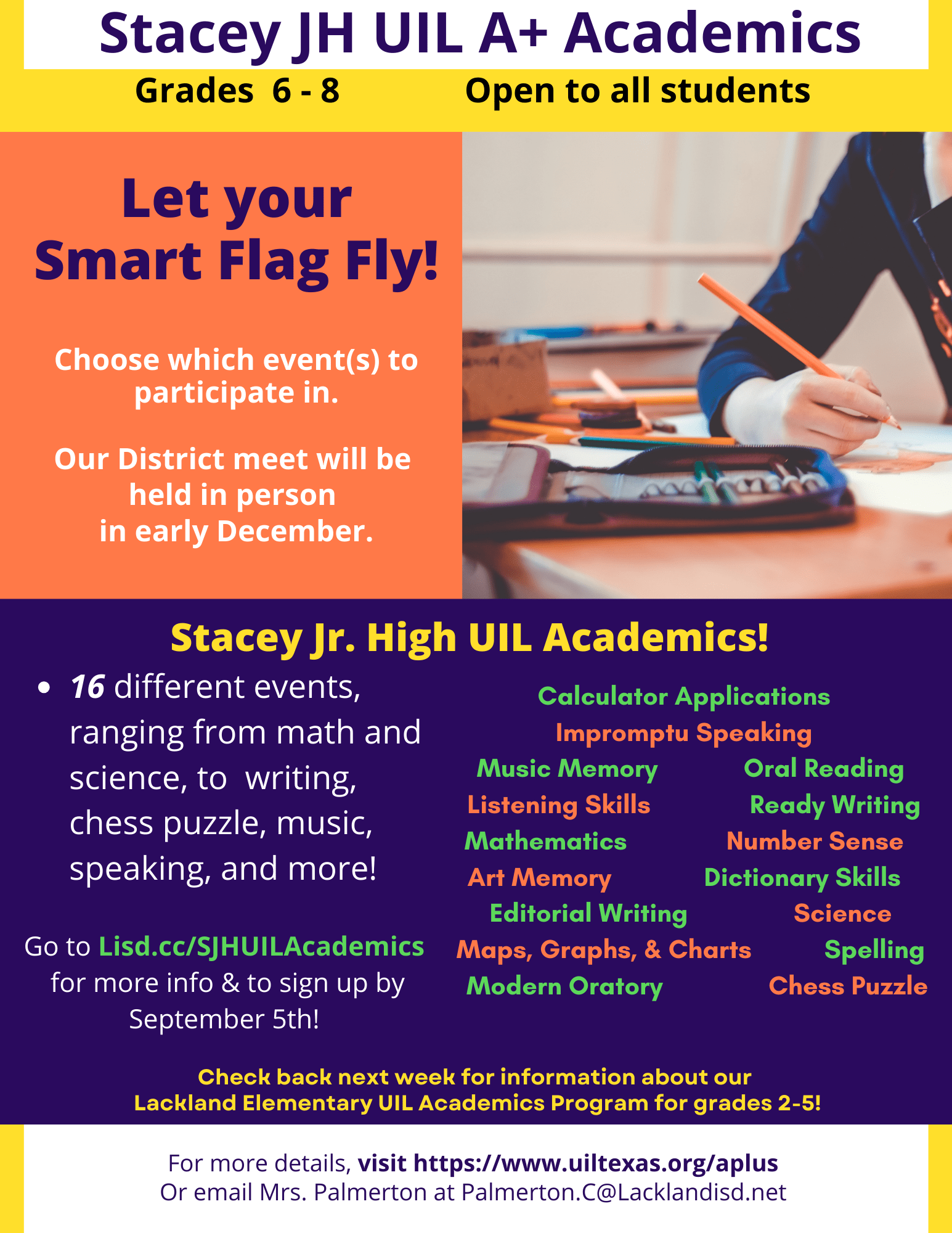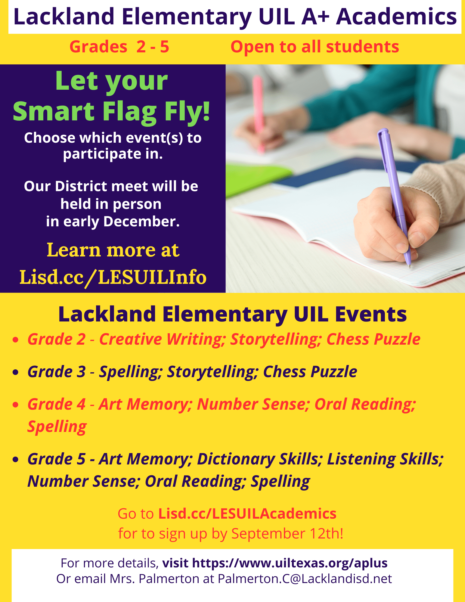 Lackland Elementary School, Mrs. Terry Leija, Leija.t@lacklandisd.net Stacey Jr./Sr High School, Mr. Hunter Shelby, Shelby.h@lacklandisd.net