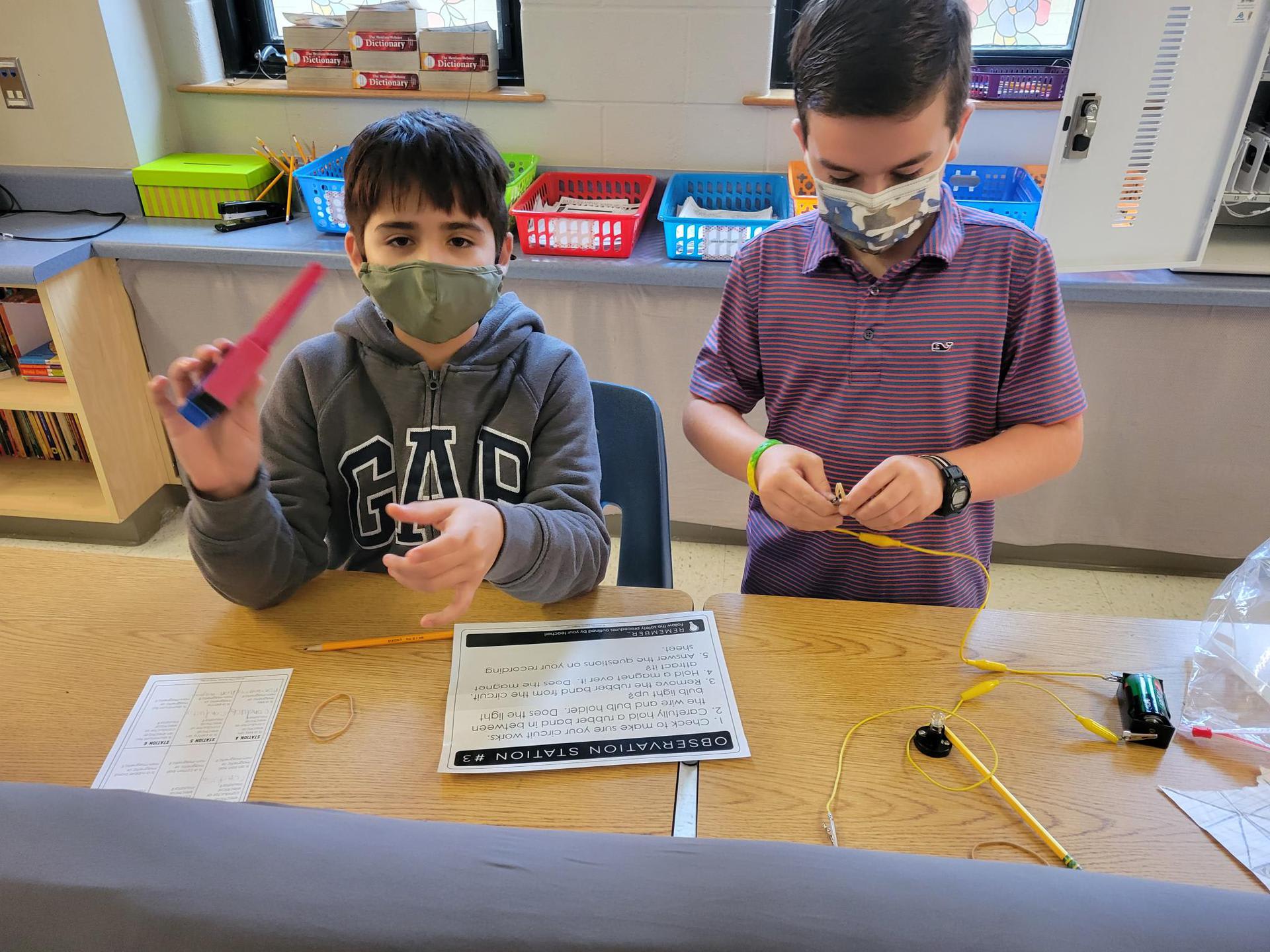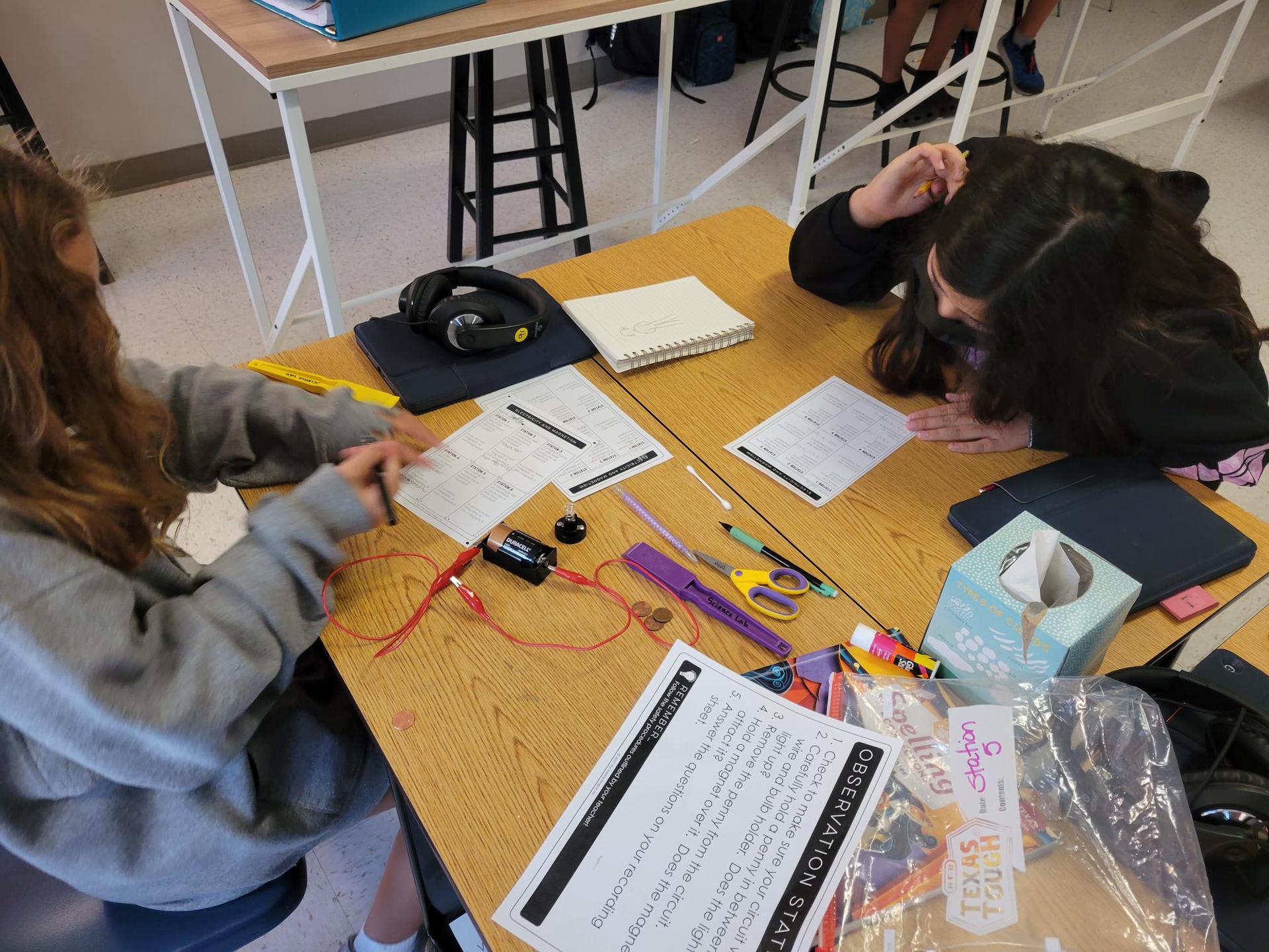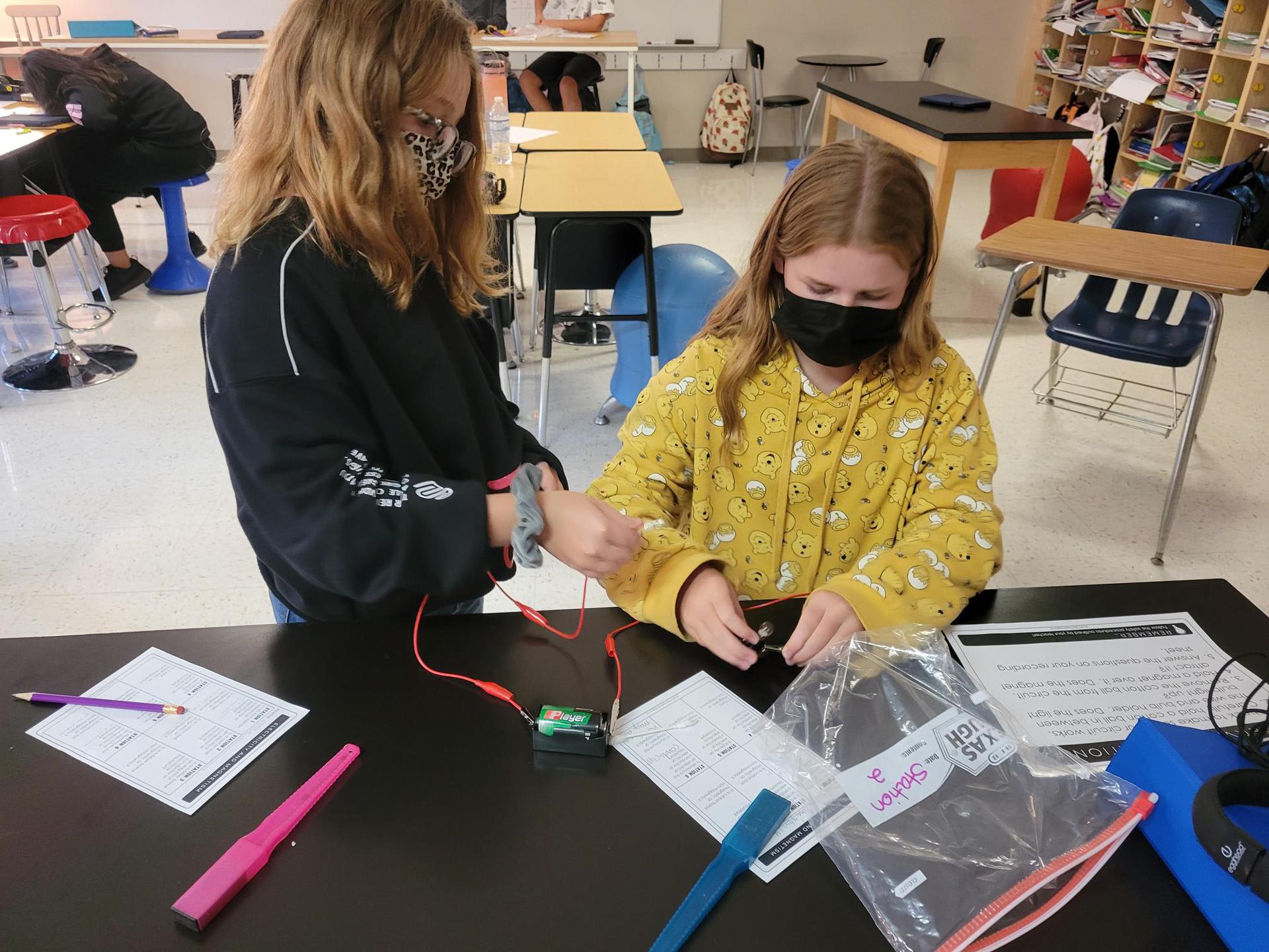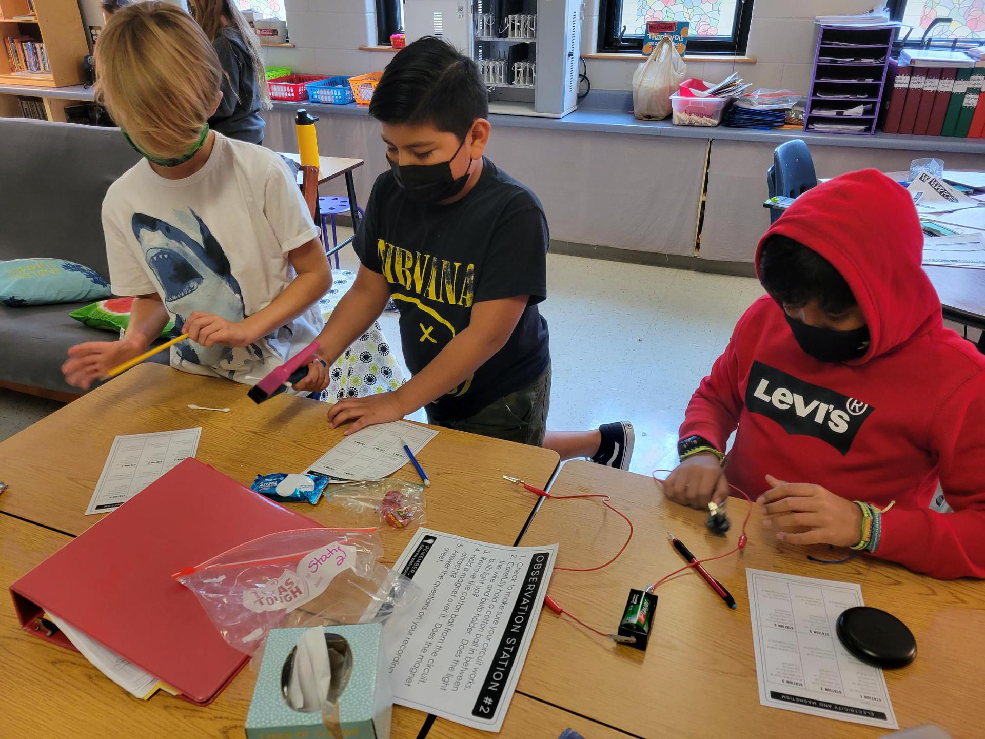 Mrs. Crawford’s class testing objects for electrical conductivity and magnetism. There may have been a few jaws dropping when pennies and aluminum foil were hooked up to the circuits. Students did a great job making hypotheses then testing to see if they were correct.