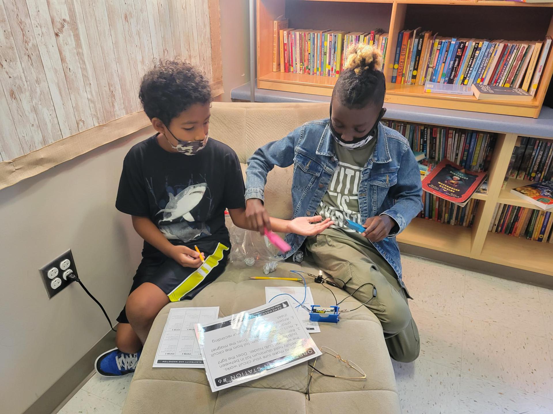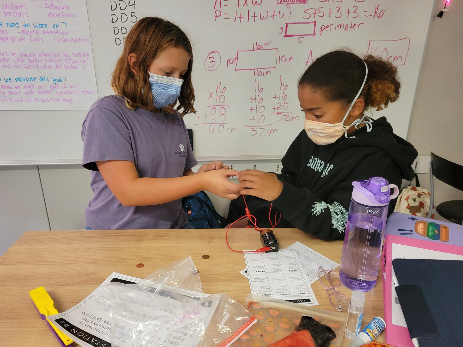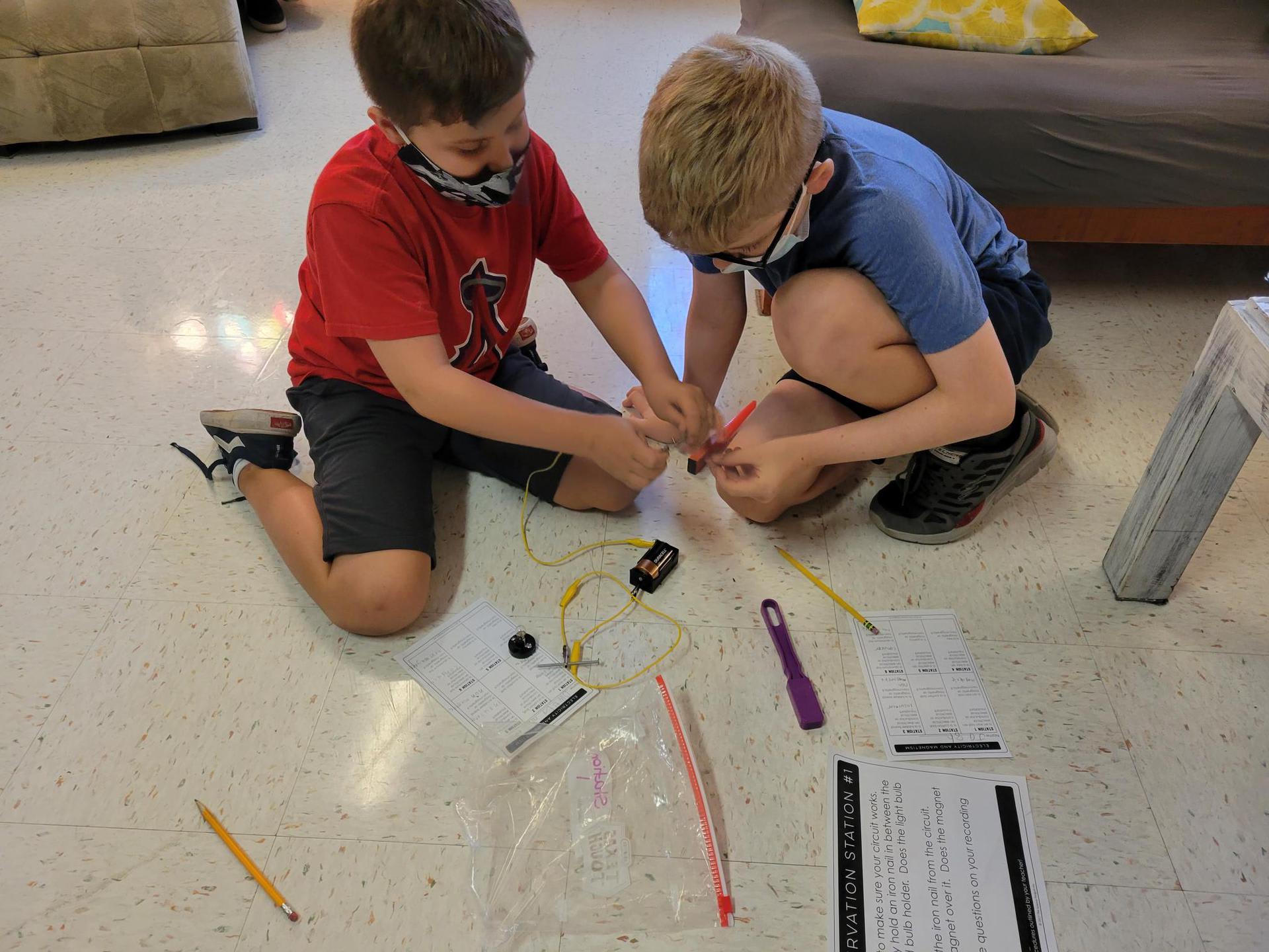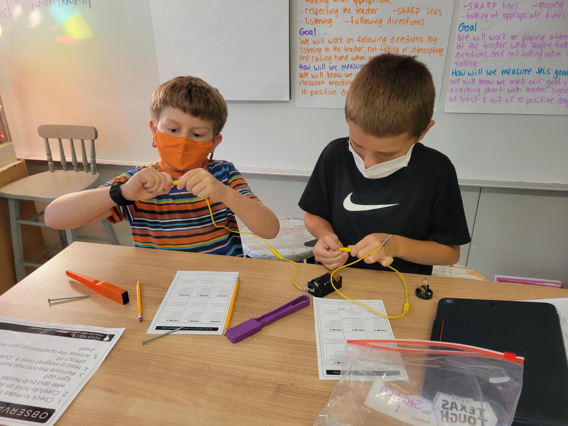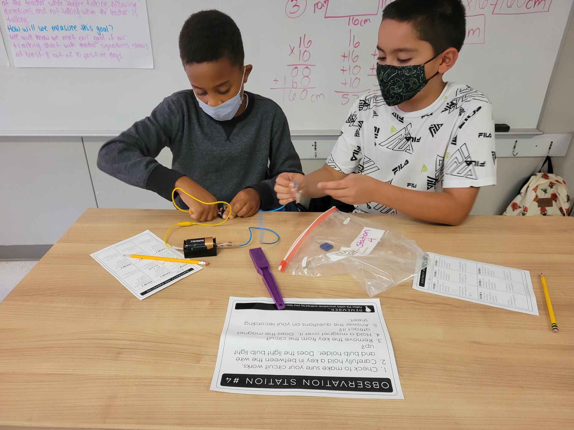 Mrs. Crawford’s class testing objects for electrical conductivity and magnetism. There may have been a few jaws dropping when pennies and aluminum foil were hooked up to the circuits. Students did a great job making hypotheses then testing to see if they were correct.