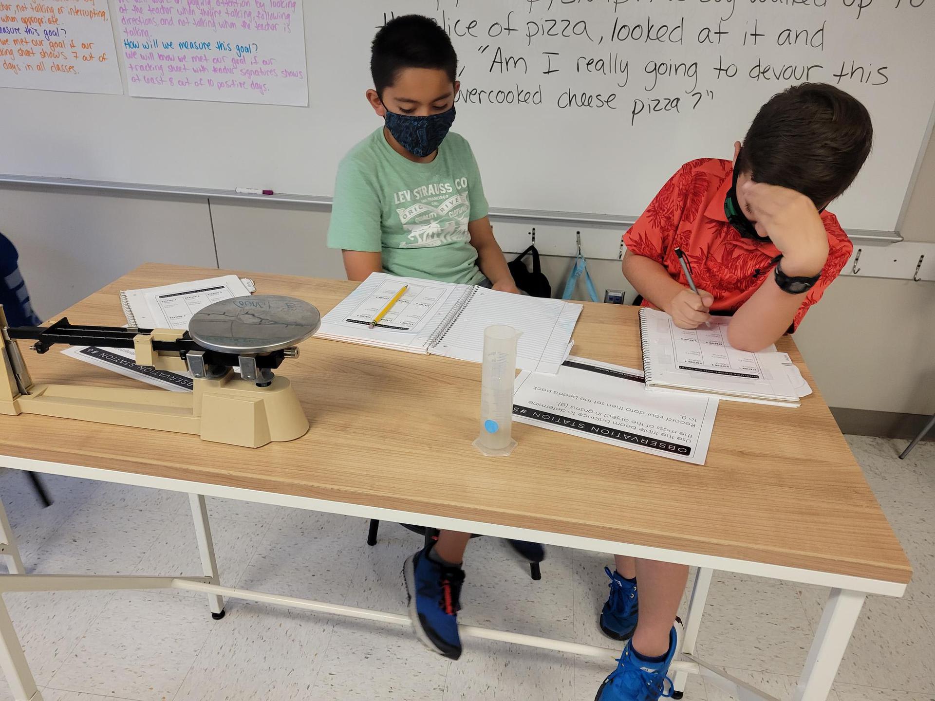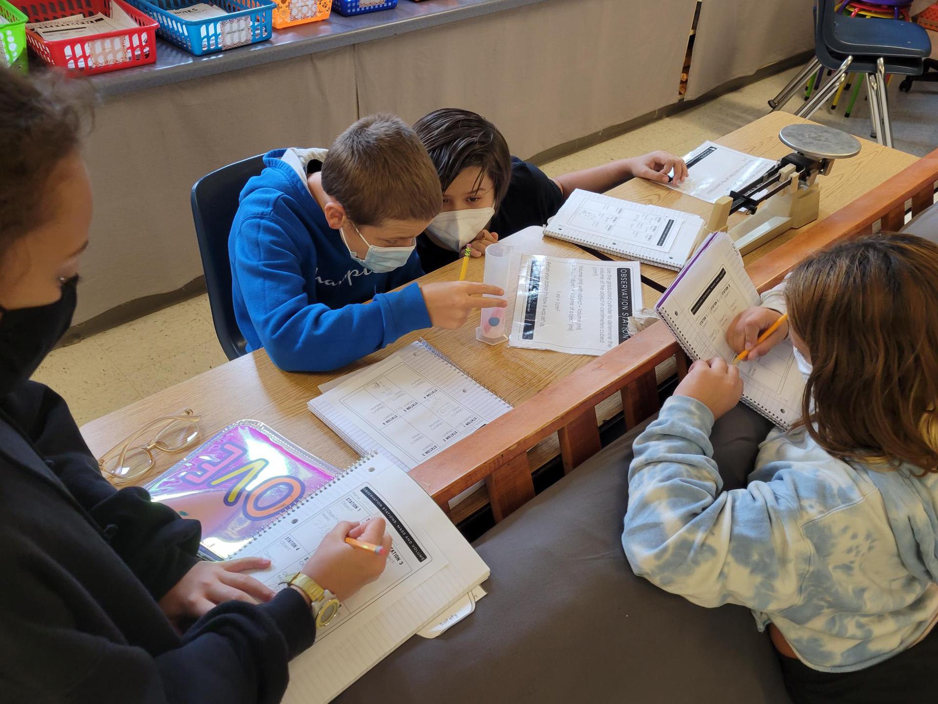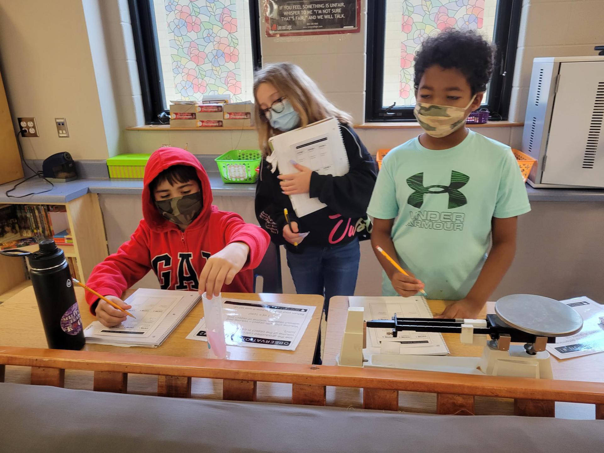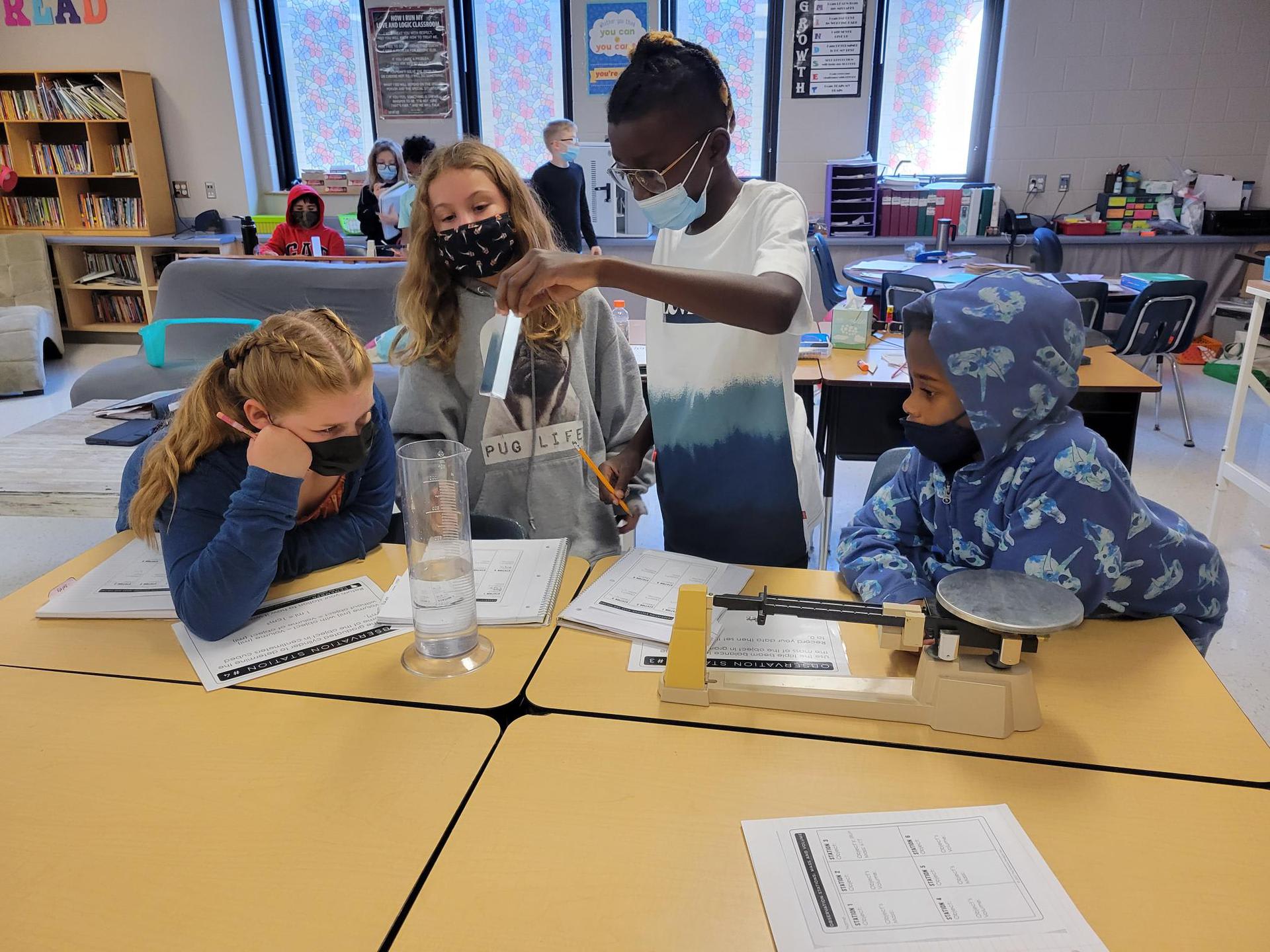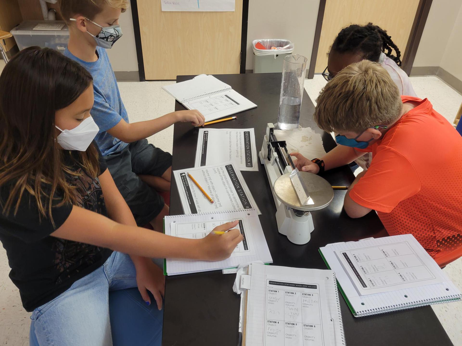 Mrs. Crawford’s class is practicing their measurement skills by finding the mass and volume of different objects.